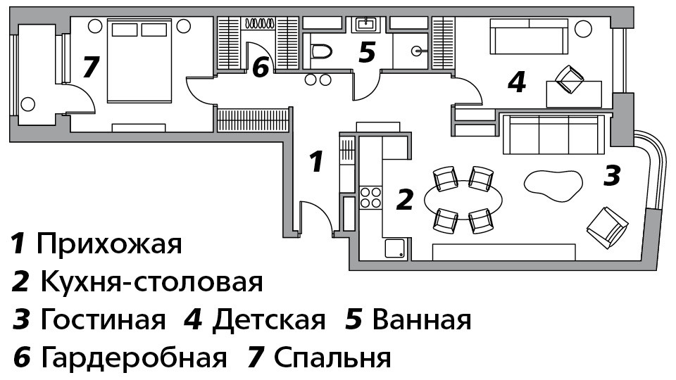По документам это апартаменты, а не жилой фонд, и ограничений на расположение мокрых зон тут нет. Но Павел рассказывает, что они не сильно отошли от планировки, предложенной застройщиком. Жилые комнаты привязаны к окнам, выходящим на две стороны, а в центре квартиры — служебные помещения.