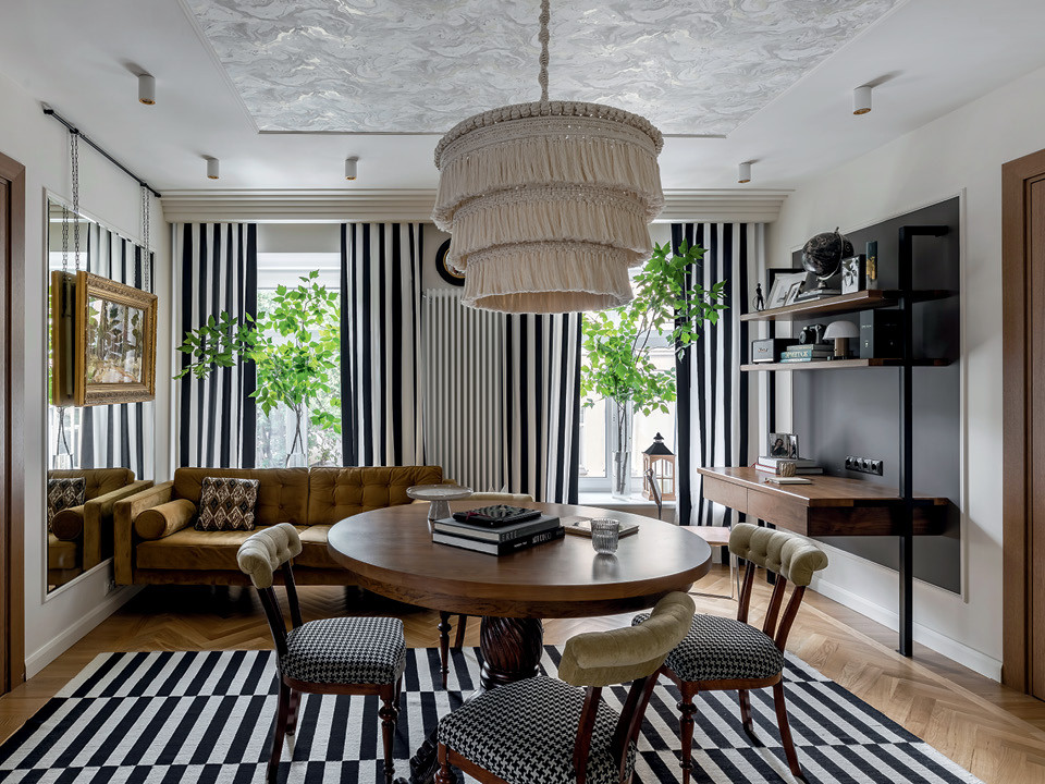 Эта часть квартиры проходная, и в нее выходит множество дверей. Чтобы придать композиции целостность и замкнутость, дизайнер выделила потолок над обеденной группой обоями, а на пол положила ковер. “Я очень люблю черно-белую геометрию и стараюсь использовать ее во всех своих проектах, но в собственной квартире по-настоящему разошлась”, — признается Мария. Шторы в полоску подчеркивают ритм окон и симметрию, их поддерживают полосатый ковер и обивка стульев. На зеркальной стене рядом с диваном висит вышивка по картине Ивана Шишкина “Корабельная роща”, сделанная бабушкой Марии. “Мне захотелось повесить ее парадно. И она задала тон этой комнате”, — говорит дизайнер.