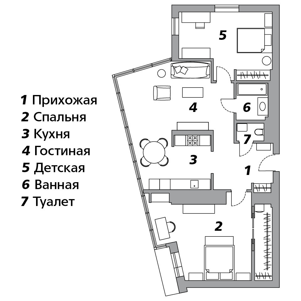 Квартира попадает в категорию “Планировки, которых лучше избегать”. Неправильной формы, с косой стеклянной стеной. Она-то и привлекла заказчиков: глава семьи работает в офисе, где окна от пола до потолка, ему нравится, когда город “входит” в квартиру. С балкона в спальне открывается вид на дубовую рощу, и это тоже было важно для покупателей. А недостатки планировки
