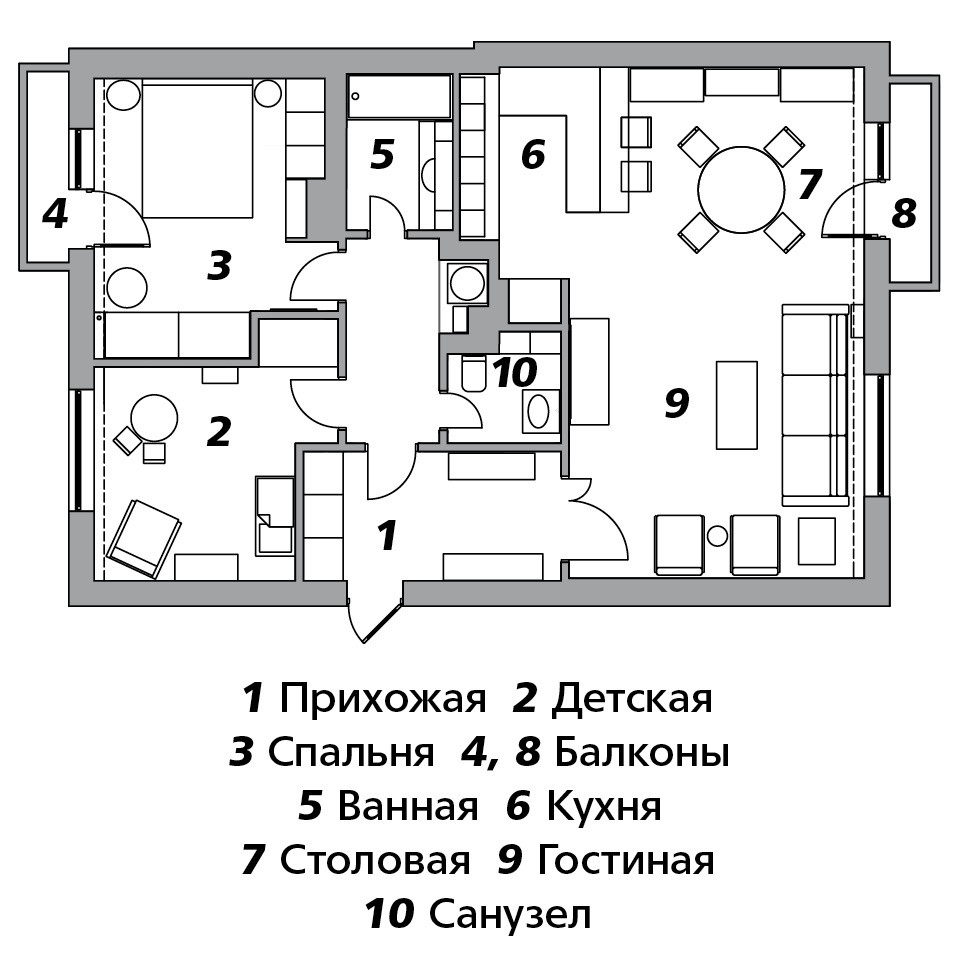 Квартира была куплена в доме 1940 года, который признан объектом культурного наследия, поэтому перепланировка исключалась. По мнению Елены Симкиной, это и к лучшему. “Мне нравятся сталинки, — объясняет она, — мы сохраняем в них все, что возможно. Конечно, это непросто, но мы уже знаем, что делать с окнами, паркетом, лепниной. Очень жаль, когда люди приобретают сталинскую квартиру, чтобы все в ней переломать. Но, как правило, большинство все-таки понимает, зачем сделали такую покупку”. Планировка оставлена фактическая: довольно длинный коридор делит квартиру на две почти равные части, справа — гостиная и кухня, слева — спальня и детская. Плюс два санузла. Возможно, что все это не наследие сталинской эпохи, а результат предыдущего ремонта, который был сделан в 2000 году, но менять планировку было нельзя, поэтому оставили все как есть. А вот внутри все переделали полностью.