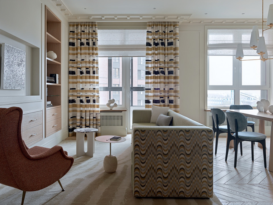 “Мы всегда сначала выбираем все отделки и обивки, складываем мудборд, согласовываем его с заказчиком и только потом выбираем цвет стен, — рассказывает дизайнер. — По сути, это просто фон для тех акцентов, которые есть в интерьере”. Окна этой квартиры смотрят на соседний дом, и солнечного света здесь немного. Логично было “осветить” интерьер с помощью краски. На фотографиях она местами кажется белой, но в