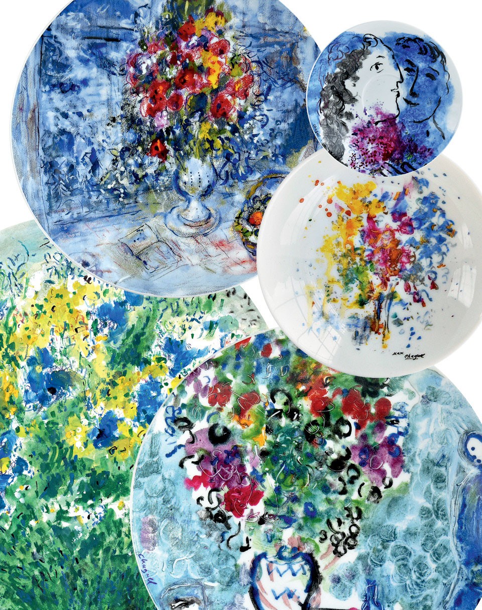 Тема цветов появилась в творчестве Марка Шагала в 1909 году, когда он встретил свою будущую жену Беллу. Художник говорил, что они олицетворяют для него саму жизнь. Поэтому, когда марка Bernardaud решила выпустить очередную коллекцию с росписями по мотивам работ Шагала, они обратились к его внучке Мерет Мейер, которая предложила выбрать картины, посвященные цветам и любви. “Задача мастеров мануфактуры состояла в том, чтобы как можно точнее