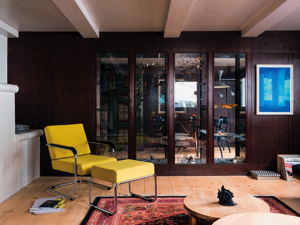 В целом интерьер шале получился довольно эклектичным. В более современной двухэтажной пристройке (ее датируют 1950‑ми годами) убрали перекрытия и сделали единое двусветное пространство, а стены расписали ромбами. Эта часть шале используется как столовая и общественная зона: здесь устраивают литературные чтения, концерты и перформансы. Хозяева вообще не против пускать к себе людей. Когда они подолгу отсутствуют, сдают комнаты отдыхающим, приезжающим на горнолыжный курорт. Сейчас во всех помещениях можно обнаружить картины и арт-объекты, созданные молодыми швейцарскими художниками, а весной 2020 года здесь пройдет выставка швейцарского видеоарта.