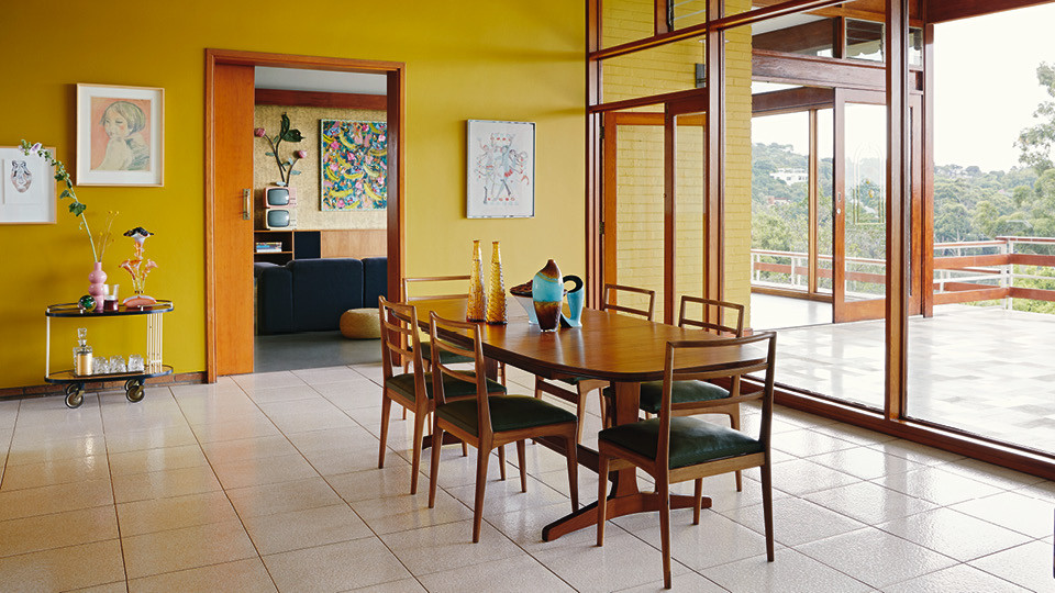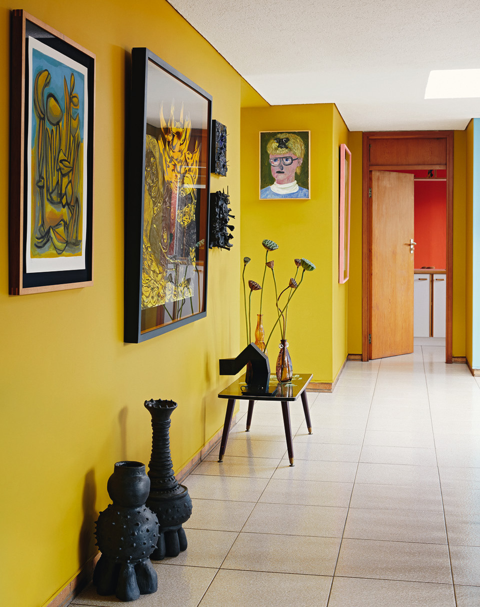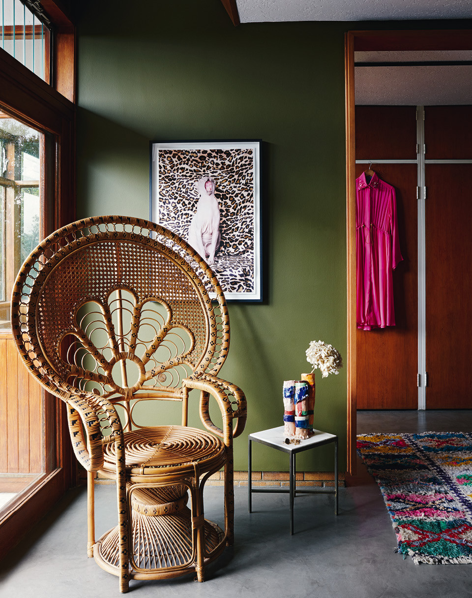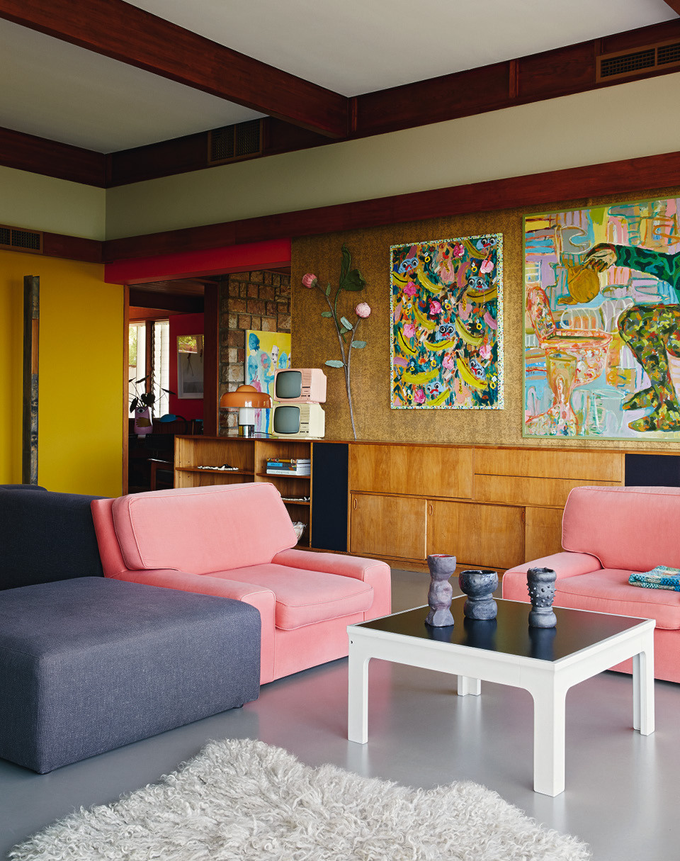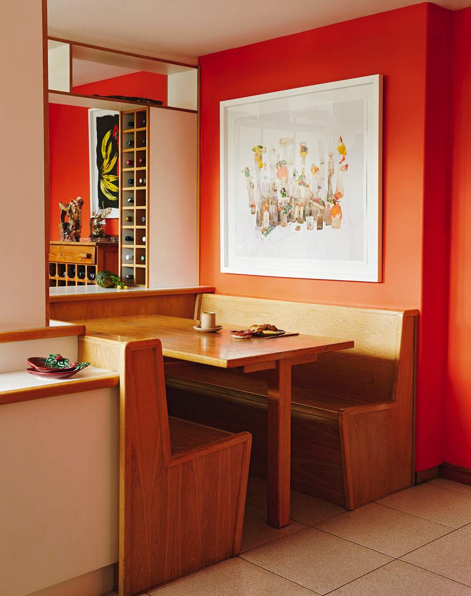 За почти шестьдесят лет дом всего дважды менял владельцев — Лезанн с мужем стали третьими, — и это объясняет замечательное состояние интерьеров. Встроенные шкафы в гардеробной, кухня, стеновые панели и даже потайной винный холодильник с аудиосистемой — все это было в целости и сохранности. Новым хозяевам оставалось лишь слегка освежить обстановку. “Нет ничего лучше краски!” — считает Лезанн, чьими стараниями дом окрасился в сочные яркие цвета. “Мне хотелось сохранить дух модернистской архитектуры, — говорит она. — Я выяснила, какие краски были популярны в 1960‑е годы, и отобрала те из них, что мне больше всего нравятся”.