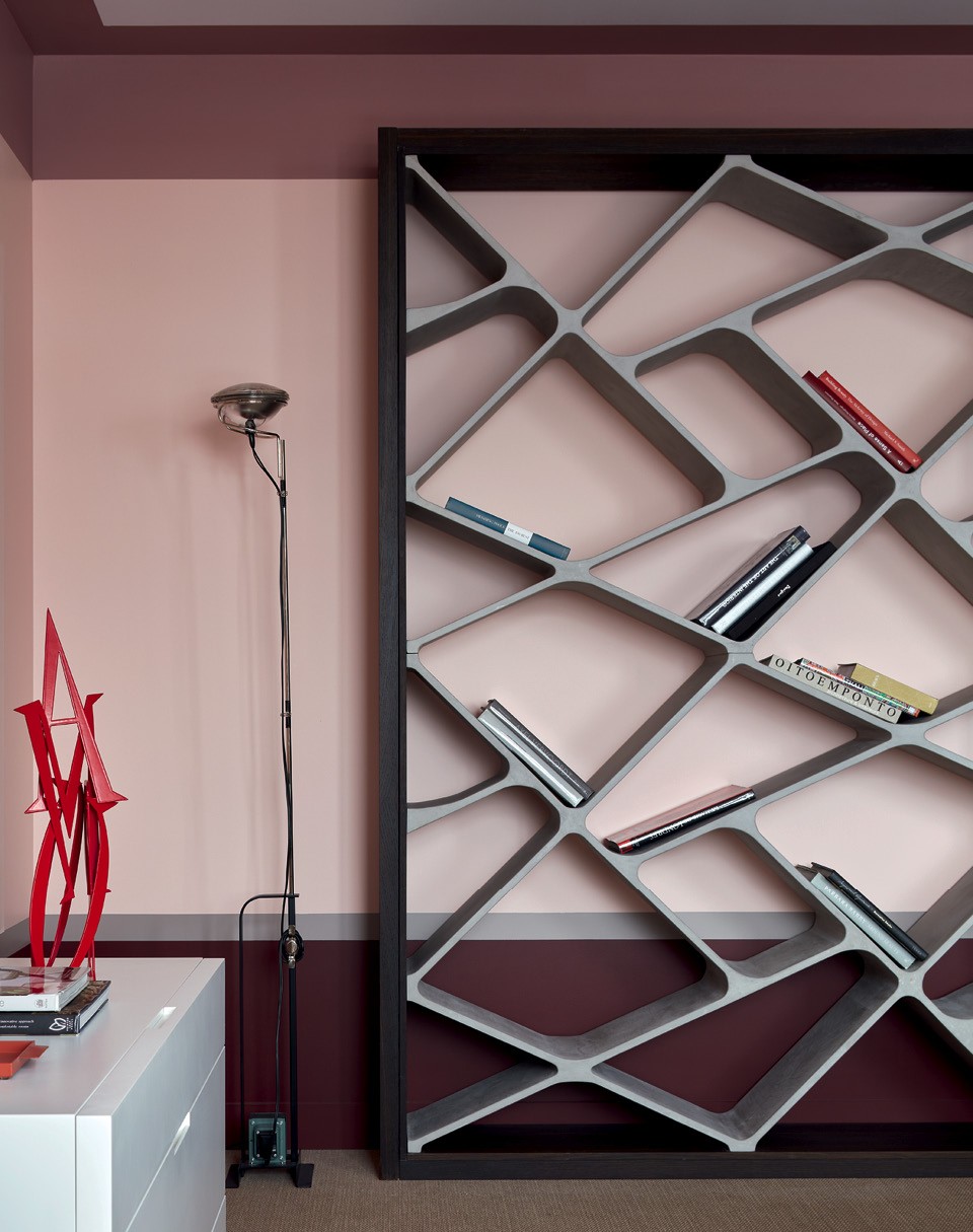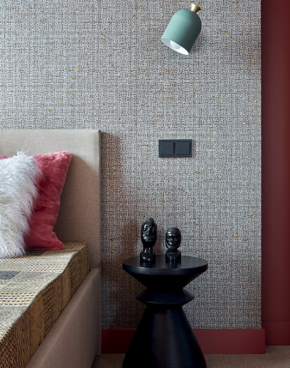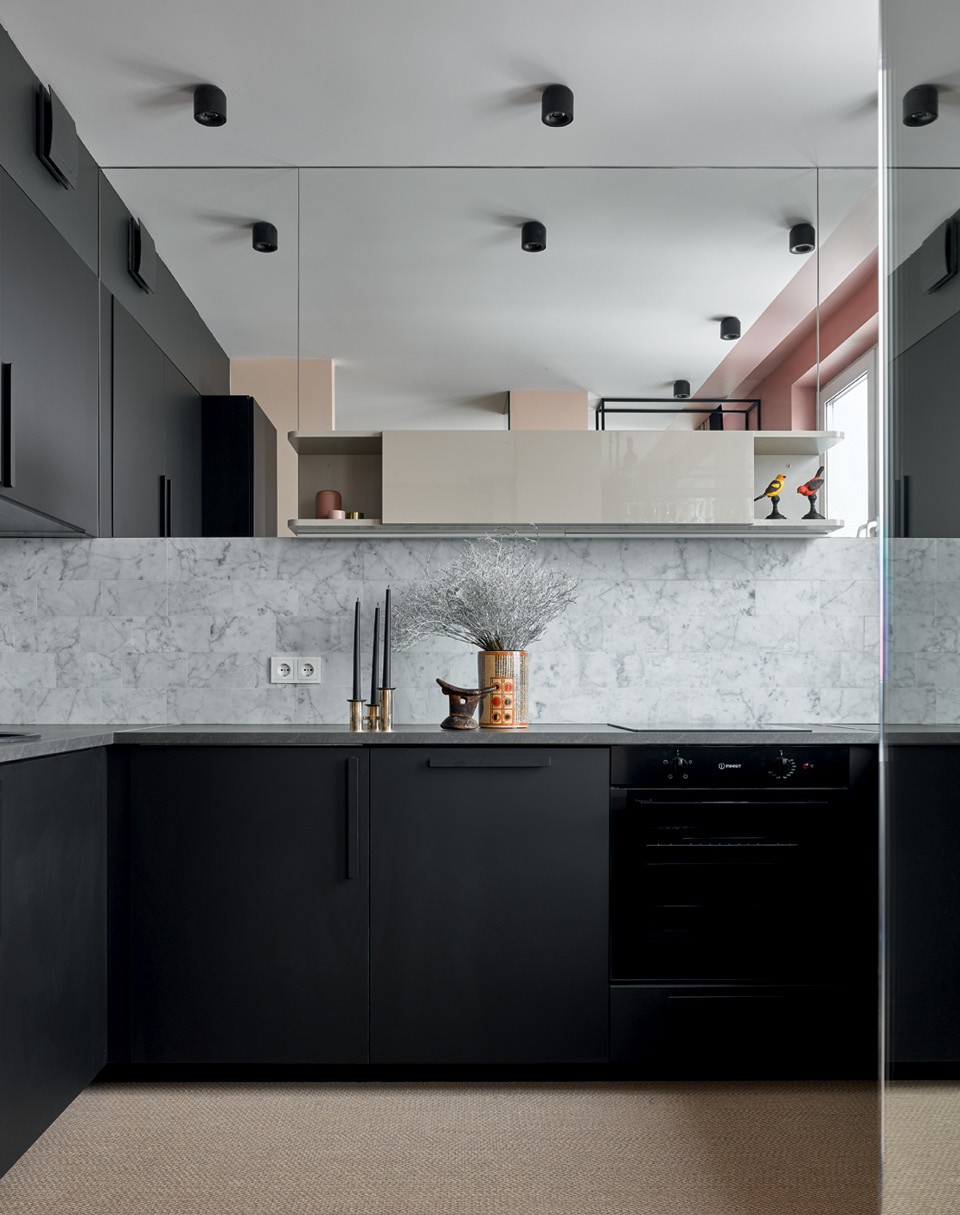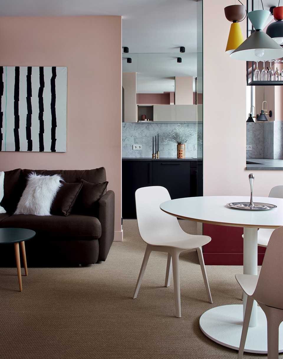 Дмитрий и Татьяна Хорошевы не устают повторять, что любые проблемы с планировкой можно скорректировать декоративными приемами. К ним обратилась молодая семья с двумя дочерьми: они купили двушку в новостройке и попросили сделать яркую, жизнерадостную квартиру, где можно и отдохнуть, и поработать, и поиграть с детьми. “Нам повезло с количеством окон, поэтому из двух комнат мы смогли сделать три: отдельные спальню и детскую и объединенное пространство гостиной, столовой и кухни”, — рассказывают архитекторы. В квартире нет несущих стен, но есть колонны посреди гостиной и несколько ниш и выступов, которые портили геометрию помещения. “Если хочешь что-то скрыть, используй зеркало, — делятся фирменным приемом Хорошевы. — Даже узкие выступы в десять-пятнадцать сантиметров можно нивелировать при помощи узкого зеркального полотна, и несовершенство планировки становится незаметным”. Ту часть кухни, что наиболее видна из гостиной, решили визуально облегчить. Для этого отказались от верхних шкафов, заменив их зеркалами, — подобный трюк заметно увеличил объем помещения и сделал его воздушным. В этой квартире превалируют два цвета — красный и розовый, а также их оттенки. Например, верхняя часть стен и край потолка выкрашены в брусничный. “Такой кант смещает геометрию пространства, и становится непонятно, какая высота потолков”, — поясняет Дмитрий. По мнению архитекторов, краски — самое доступное средство сделать классное пространство, если бюджет ограничен.