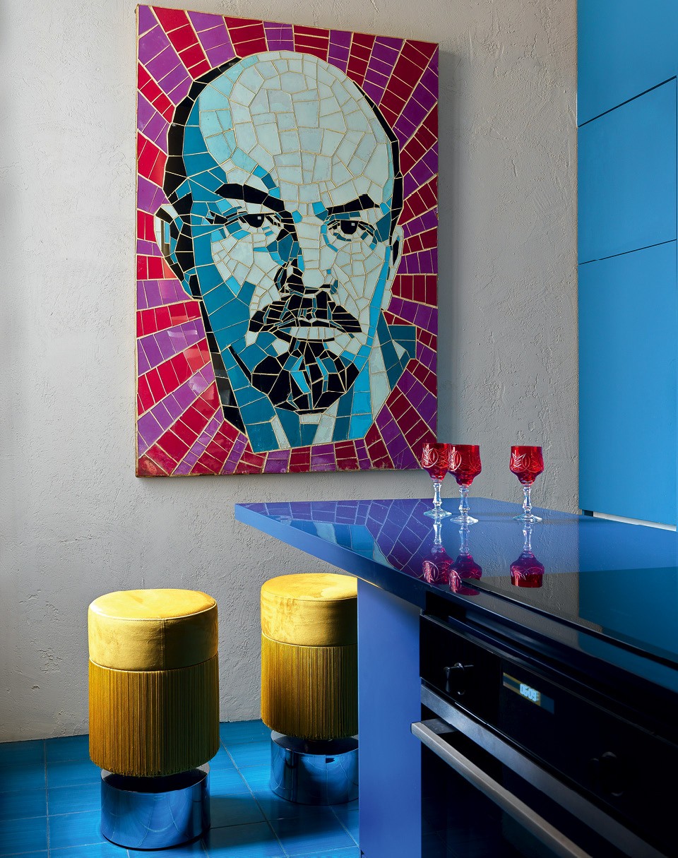 Выступающую полукругом стену гардеробной Дарья решила украсить состаренной росписью в стиле шинуазри. Она загадочно поблескивает в лучах солнца, которого в квартире с такими окнами хоть отбавляй. Еще один рисунок, с лотосами, появился в зоне ванной. Он покрыт живописными подтеками, которые, судя по близости к воде, будут только прогрессировать. Василькова вообще считает, что в потертостях и несовершенстве нет ничего плохого: “Главное, чтобы вещь красиво старилась”. Этой концепции соответствует неравномерно прокрашенная плитка ручной работы, которой частично выложен пол и обшит санузел, и сплетенные из тряпичного материала коврики и куклы-русалки, и разбросанные по стенам пуговки-светильники. Хотя в квартире нет прямых отсылок к южным странам (разве что стены охристого оттенка, напоминающего цвет фасадов во многих итальянских городах), в ней чувствуется радость жизни, тепло и легкая отпускная расхристанность. Даже мозаичный Владимир Ильич имеет яркий дискотечный раскрас. Не зря же у окна примостилась диджейская стойка — танцуют все.