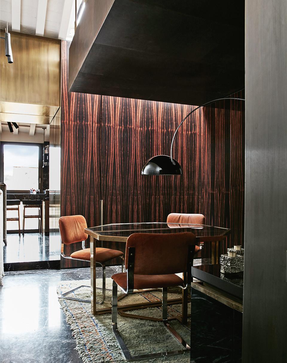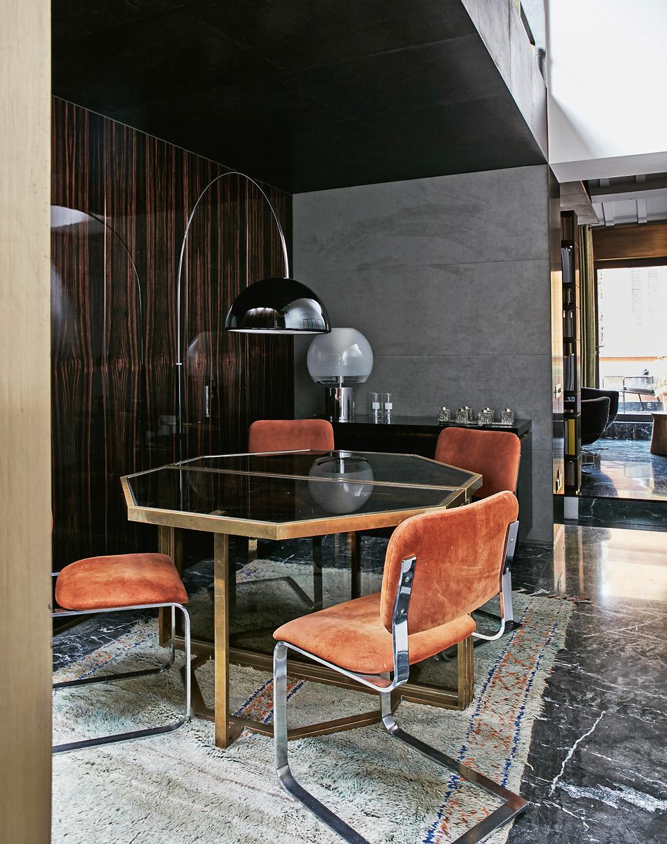 Столовая разместилась в самом центре общественной зоны и занимает небольшую нишу. Одна из ее стен облицована эбеновым деревом, вторая обита алькантарой, на полу — мрамор. Прибавьте к этому марокканский ковер и латунь, использованную в отделке винтажного стола, и возникнет вопрос: не слишком ли много здесь намешано? Но архитектор проблемы в этом не видит: “Сочетание разных материалов придает пространству глубину”, — считает он.