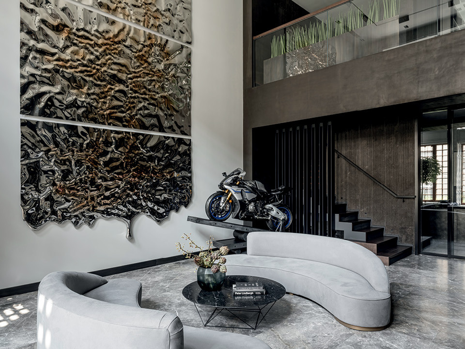 Олег Клодт и Анна Агапова оформили представительский офис, в котором неожиданно нашлось место даже мотоциклу.