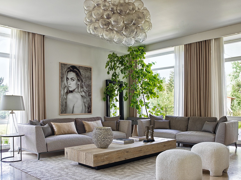 В целом интерьер получился элегантным и сдержанным, в нем все построено на сочетании природных оттенков и натуральных фактур. “В доме большие панорамные окна, поэтому мы его и выбрали. Из них открывается вид на сад. Мне нравятся идеи нидерландского дизайнера Марселя Волтеринка, в его проектах интерьер и ландшафт — это единый ансамбль. Я тоже постаралась сделать так, чтобы обстановка не спорила и не отвлекала от того, что происходит на улице: весной сад в белых цветах, а осенью — в огненных оттенках. Цветовая гамма интерьера отлично сочетается с любой палитрой за окном”, — рассказывает Элен. Она считает себя идеалистом и гедонистом: если предмет неудобный или не нравится