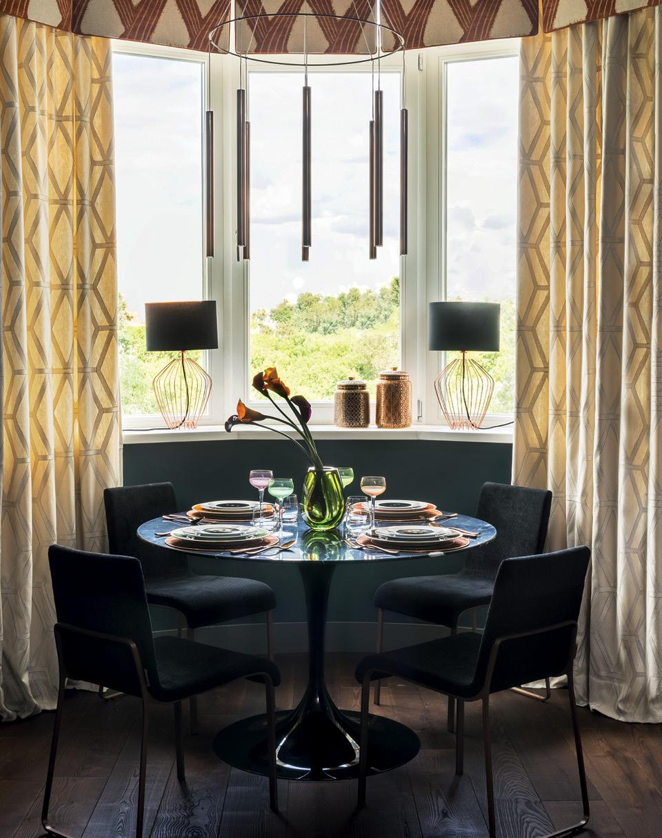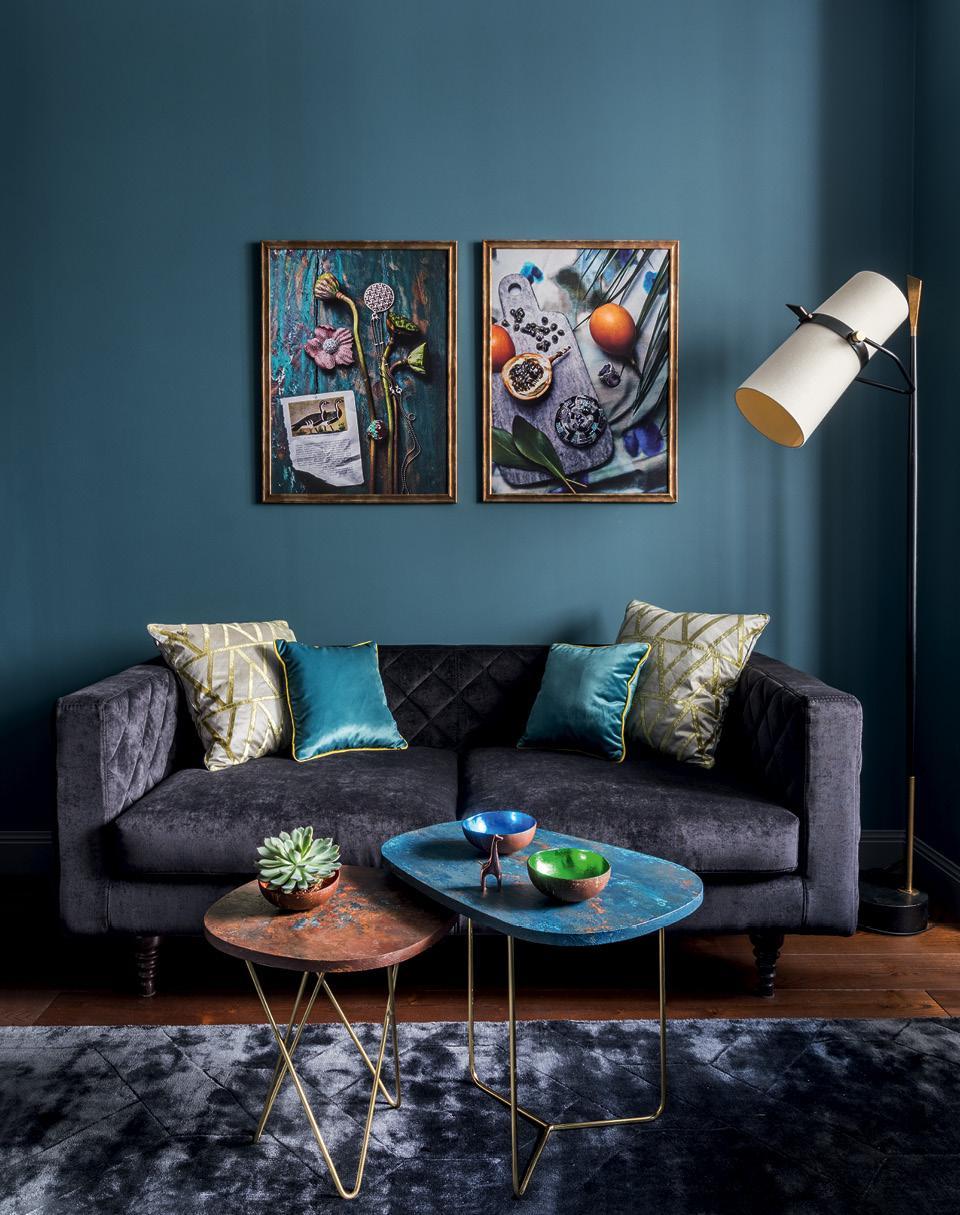 Женя фантазировала на тему глубокого синего, малахитово-зеленого, возможно, терракотового, но окончательная картина сложилась, когда в журнале AD она увидела съемку Наталии Обуховой “Уроки истории”. “Когда я увидела эти работы, у меня, в принципе, сразу все встало на свои места. Может, еще не полностью детализированная концепция, но я поняла, что у нас здесь будут фактуры, сочетания великолепного синего с оранжевым и с медью, будет ощущение глубины”, — делится Женя.