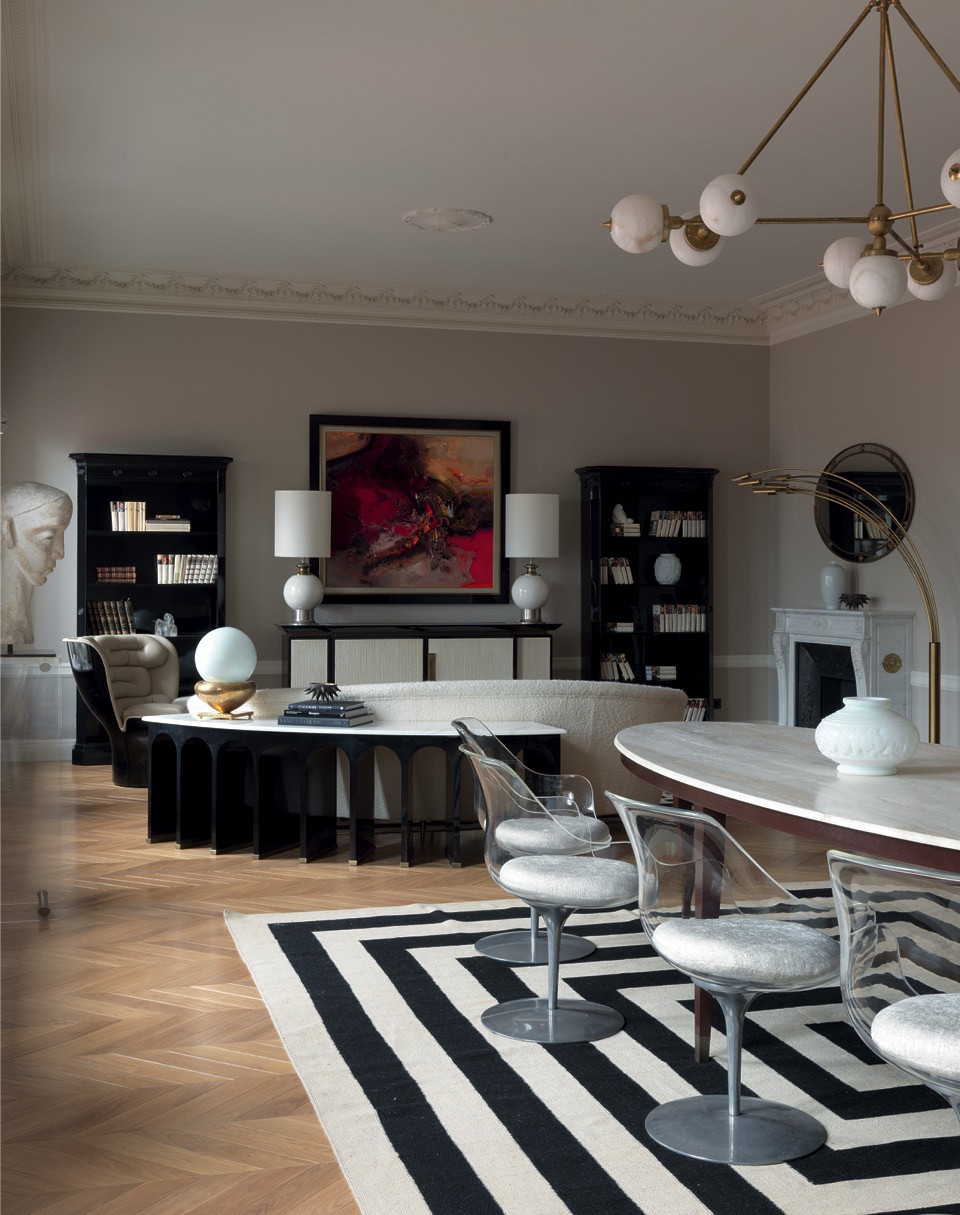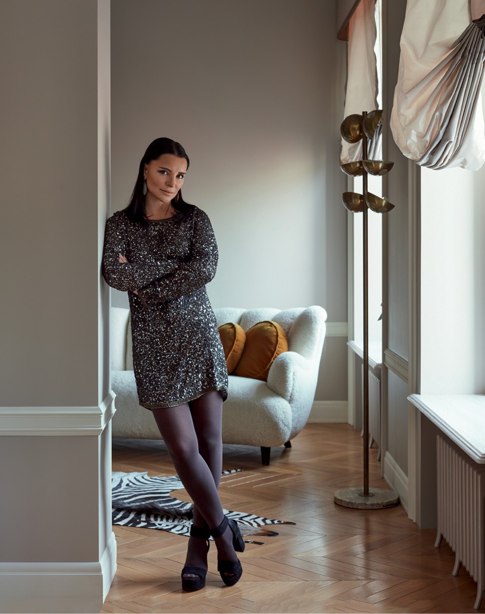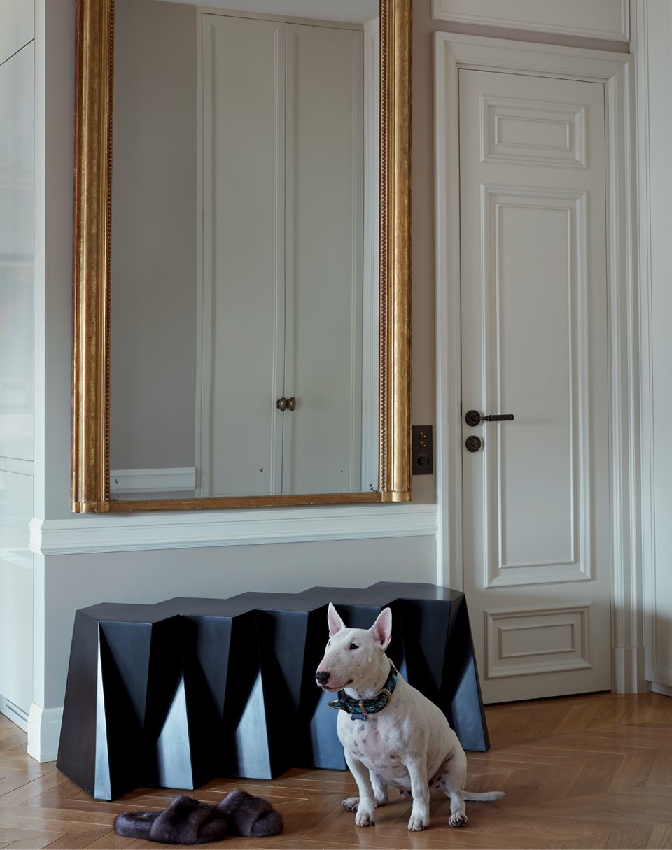 Квартира в трех шагах от “Мехового холодильника” (здания 1912 года постройки, где базируется компания “Меха Екатерина”) стала удобным дополнением к загородному дому Екатерины. “У меня огромная семья, мы еле помещаемся в доме — сыновья, бабушки, дедушки, — но иногда нужно остаться в центре, — рассказывает она. — Я купила квартиру еще до начала реконструкции, поэтому у меня было много времени, чтобы подумать над планировкой”. Обычно Екатерина оформляет свои дома сама, так же она хотела поступить и здесь и даже успела сделать санузлы и пустить по периметру комнат лепнину. А потом решила, что вдвоем будет проще, и пригласила старую знакомую — Лейлу Улуханли. “Не представляю себе, как люди отдают интерьер на откуп дизайнеру. Я так не могу, — рассказывает Екатерина. — Мне очень нравятся работы Лейлы, но жить-то мне! Поэтому проект у нас получился совместный”. И это не преувеличение: за мебелью заказчица и декоратор отправились в Париж и в итоге купили почти все на блошином рынке Сент-Уэн. “Мы ходили туда как на работу”, — смеется Екатерина.