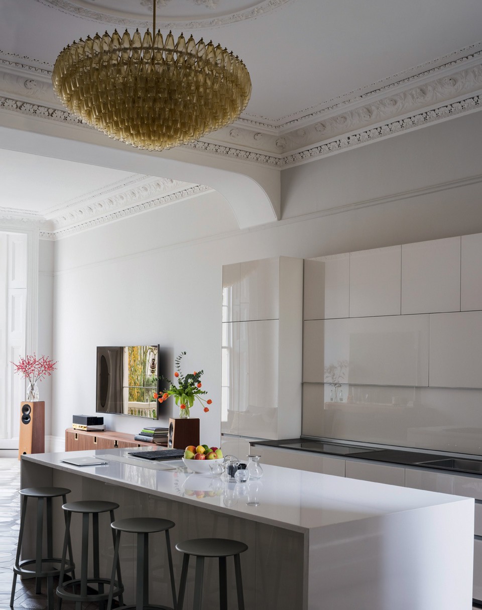 В лондонском таунхаусе дизайнера Кристины Крей две кухни: одна наверху, другая в полуподвале. На верхней (она как раз на фото), от Valcucine, хозяйка любит готовить завтраки и сервирует их прямо на острове. А вечером эта кухня, объединенная с гостиной, становится прекрасным местом для небольшой вечеринки с друзьями.