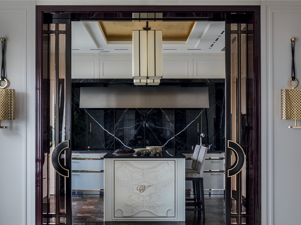 Огромная стальная вытяжка, в которую влюбились хозяева квартиры, стала главной деталью кухни в московской квартире по проекту Марины Филипповой. Дизайнер выбрала минималистичный гарнитур SieMatic, который в сочетании с высоким мраморным фартуком и нарядным торцом острова выглядит вполне классическим.