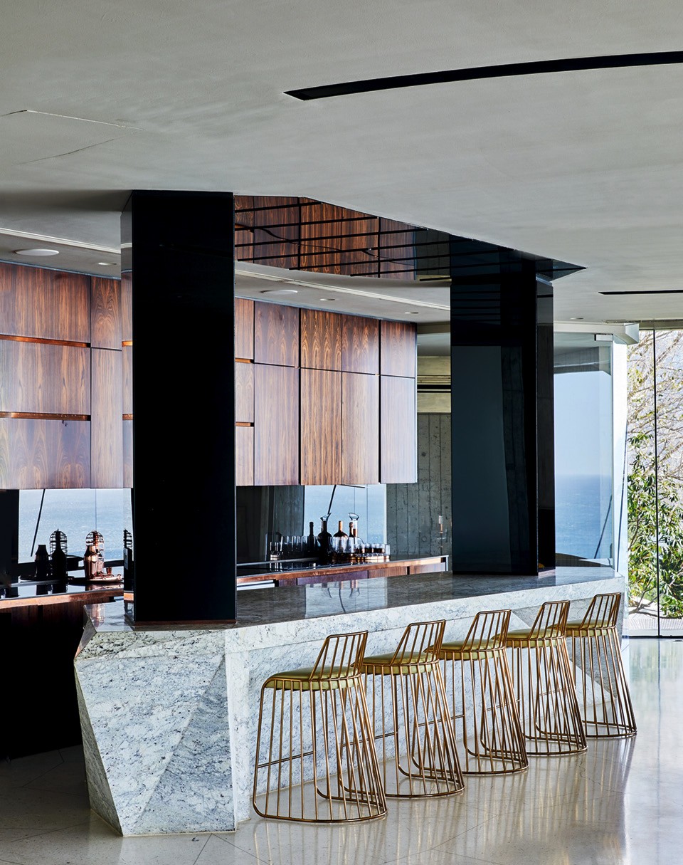 Многогранный остров выполняет функцию барной стойки на кухне этого кейптаунского дома. Остров сделан из светлого мрамора с прожилками, а декоративные колонны покрыты черными зеркалами. Рабочая зона расположена вдоль стены, а вся утварь хранится в верхних шкафах с фасадами из бразильского палисандра.