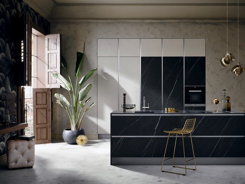 Основная рабочая зона кухни Häcker — остров. Фасады шкафов двух цветов: керамические с мраморным рисунком рядом с мойкой и бытовой техникой и из светлого бетона там, где меньше вероятность испачкать поверхность. А за счет контрастных цветов и отсутствия ручек эта минималистичная кухня выглядит строго и очень эффектно.