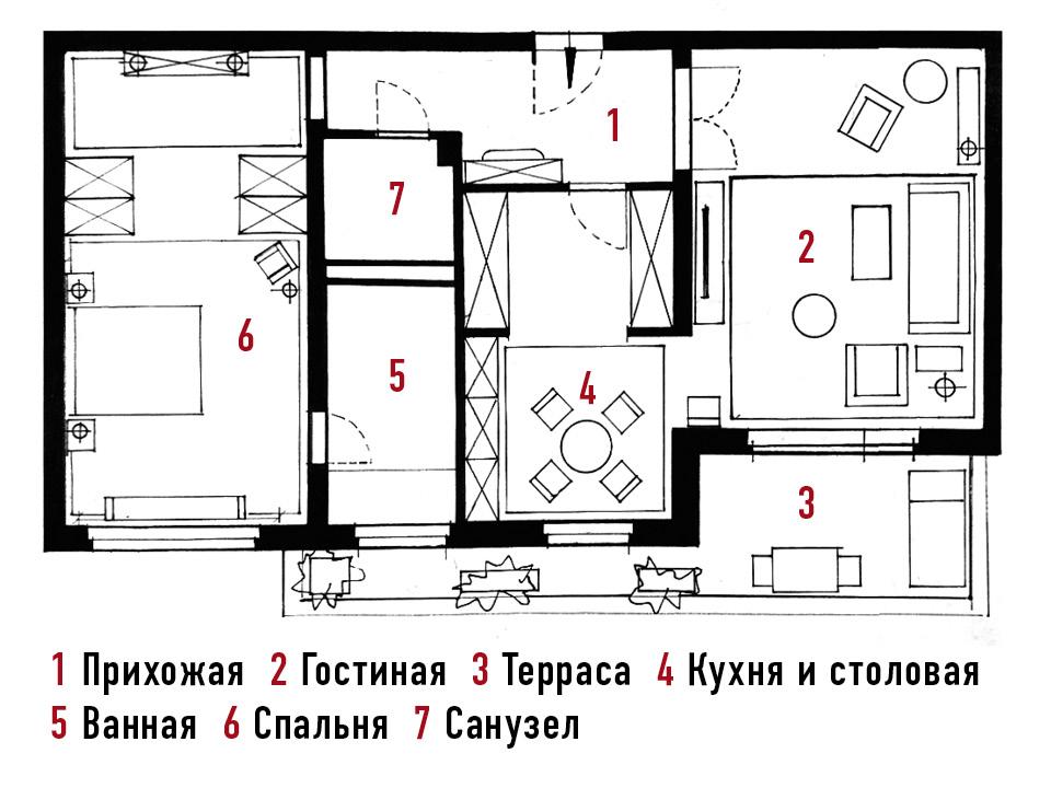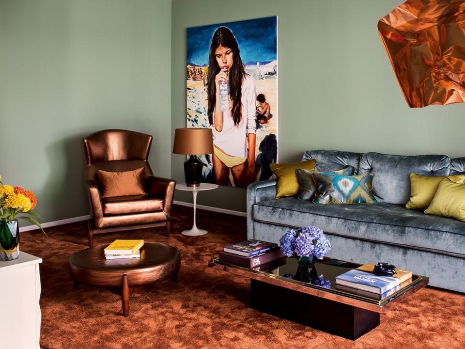 База для воплощения пожеланий хозяина была удачной: абсолютно белое пространство квартиры в новостройке, поделенное на зоны. Здесь уже были выделены гостиная, столовая с кухней, прихожая, спальня с ванной комнатой и гостевой санузел. “Для покраски стен я использовал шесть разных оттенков синего и зеленого. Получилось очень уютно”, — считает Штутц. Если цвет фасадов Зимнего дворца отвечает за стены, то бронзовый ковер, кресло и скульптура Оливии Стил — за “золотые” архитектурные элементы на них. Однако на этом ассоциации с питерским дворцом заканчиваются. Обстановка в квартире состоит исключительно из предметов интерьера 1950‑1970‑х