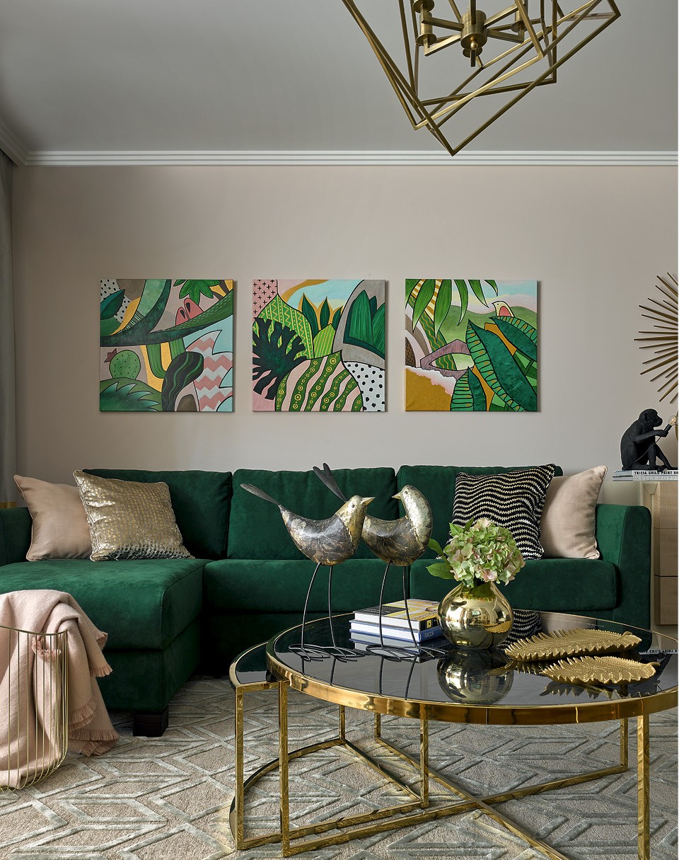 Хозяйка этой московской квартиры любит зеленый цвет, обожает путешествовать и хотела, чтобы обстановка ее дома напоминала об отпуске. Дизайнер Елена Маркина, работавшая над проектом, воспользовалась этим и создала в интерьере атмосферу тропиков: помимо различных оттенков зеленого тут появился пудрово-розовый, похожий на лучи закатного солнца, которым любуются отдыхающие. Триптих в гостиной, написанный специально для этой квартиры, декоративные фигурки экзотических животных и птиц поддерживают общее настроение, и на них возложена еще одна обязанность: попугаи скрывают от глаз электрический щиток, а жираф прячет технический люк в санузле.