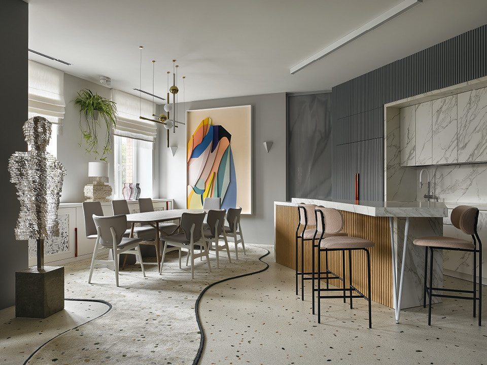 Светлана и Илья Хомяковы уже работали с заказчицей над проектом, который носил кодовое имя “квартира-огонь” и был опубликован на обложке сентябрьского номера AD в 2018 году. В нее она переехала из предыдущей квартиры, которую сразу передала в работу Хомяковым с просьбой сделать непохожей на предыдущую. “Если там все роскошно, ярко, много антиквариата и искусства, то здесь она хотела что-то современное и лаконичное, но при этом жизнерадостное”, — рассказывает Илья. Основная сложность была в конструкции дома — у него скошенные углы, отсюда и неудобные планировки квартир, в которых практически невозможно сделать помещения правильных форм. Локально переделывать ремонт середины нулевых не имело смысла, поэтому архитекторы решили снести все до бетонной коробки и отстроить заново. “Концептуальная идея этого проекта — единение архитектуры дома и интерьера, — поясняет Илья. — Здесь невозможно было использовать классические декоративные приемы, поэтому мы отталкивались именно от пространства, которое дополняли и подчеркивали при помощи цвета и форм”. Отсюда и многочисленные линии на полу, и сложносочиненные ковры, и плавные формы мебели. При этом квартира не выглядит расплывчато. Строгость ей придают вертикальные рейки и геометричные предметы, большую часть которых Хомяковы придумали сами. “Все арт-объекты и искусство появляются в наших интерьерах еще на стадии эскизов, — говорит Светлана. — Начиная работу над любым проектом, мы очень много общаемся с заказчиком, чтобы учесть его пожелания и потребности. В данном случае она просила добавить много уникальных предметов”.