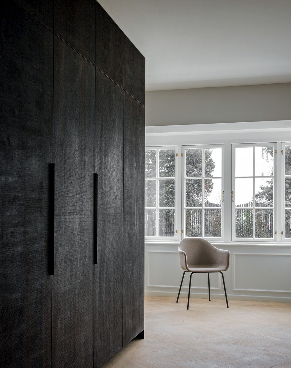 Когда-то это был летний дом дизайнера Поуля Хеннингсена, в 2014 году он пережил пожар, а несколько лет спустя был восстановлен по заказу молодой датской семьи. Хотя здесь мало что сохранилось от исторического антуража, о прошлом напоминают паркет “елочкой”, стеновые панели и оконные переплеты. Темные параллелепипеды кухни и встроенной мебели противопоставлены традиционной белой “коробке” — этот контраст подчеркивает масштаб помещения и воздух. Пространство получилось настолько чистым, что каждая мелочь, вплоть до кухонных смесителей, выглядит объемно и значимо.
