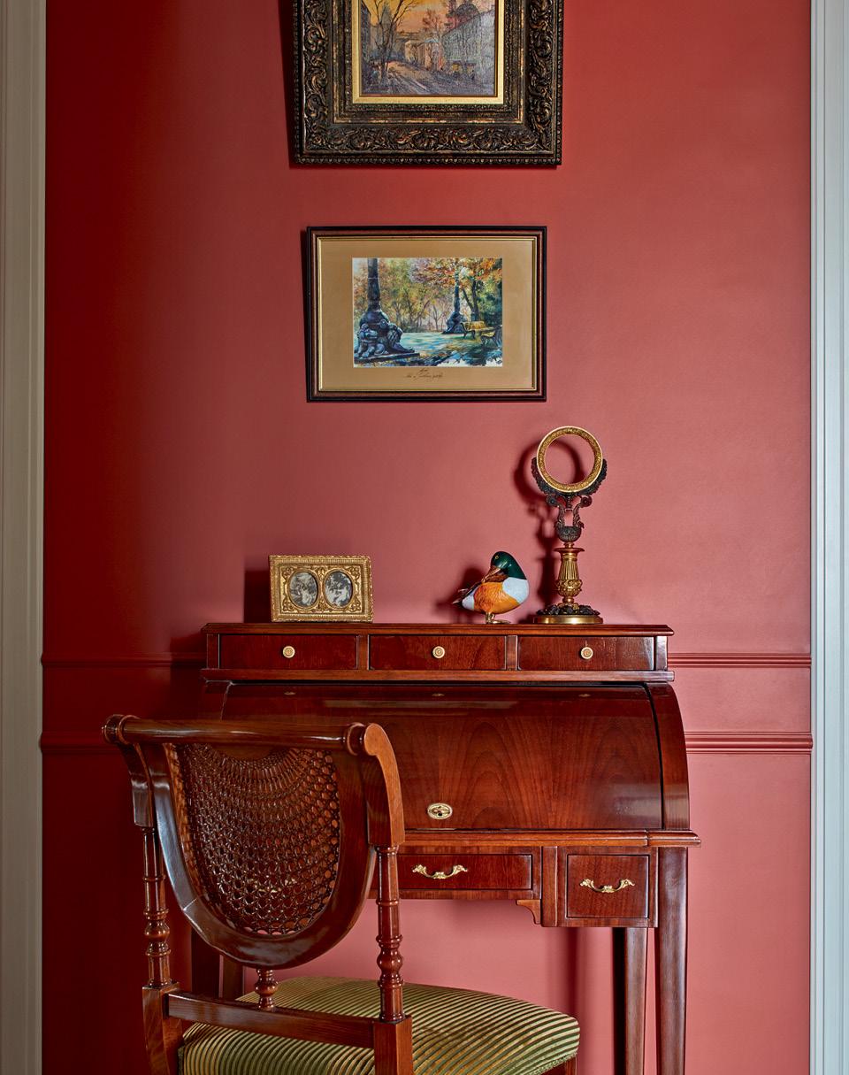 За колористическую основу была взята классическая викторианская палитра: теплый зеленый цвет, терракота и золотистая охра. Этот триумвират повторяется практически во всех помещениях: один цвет становится основным, остальные присутствуют в виде акцентов, а интерьер смотрится очень цельным и органичным. Так, за золотистой прихожей распахивается эффектный