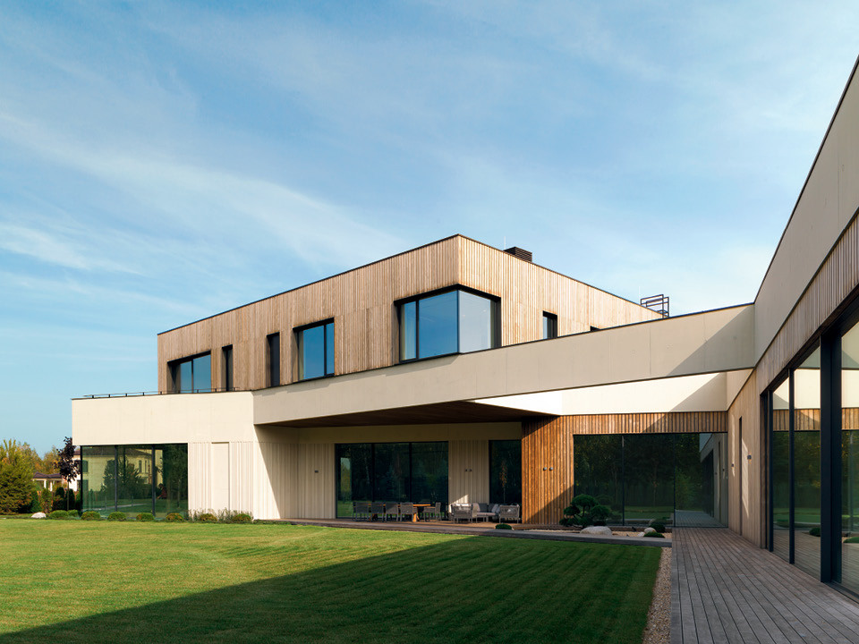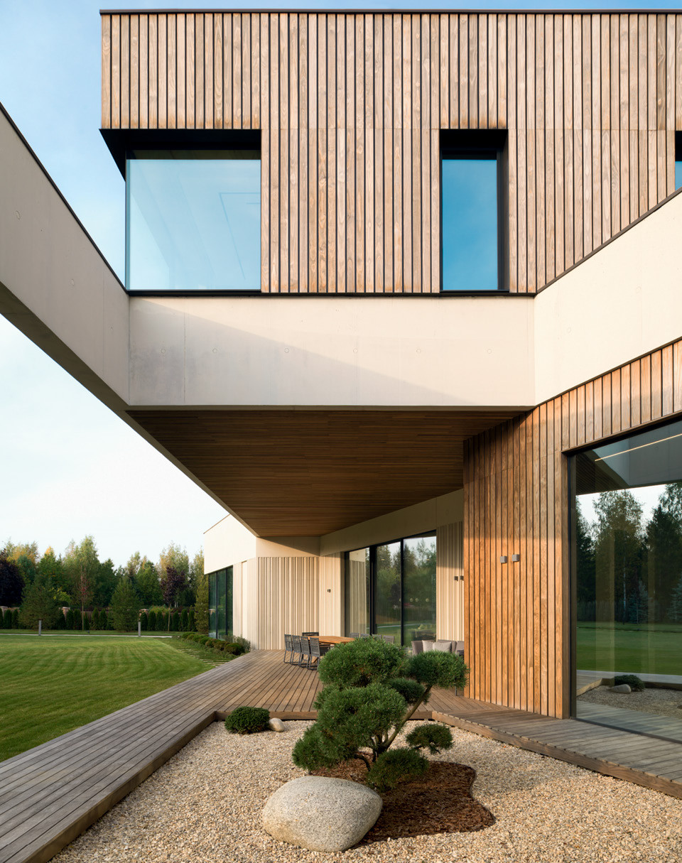 Дом в подмосковном поселке “Миллениум Парк” сперва обращает на себя внимание необычной формой — современная архитектура в наших широтах по‑прежнему встречается не так часто, как хотелось бы. Здание, которое придумала и построила Александра Хелминская-Леонтьева, состоит из двух объемов. Нижний — в форме буквы Г, развернутой навстречу соседней роще и ручейку. В нем, как водится, находится общественная зона плюс спа и бассейн. Второй этаж, который занимают четыре спальни с ванными и гардеробными, проще и напоминает сплющенный кубик, но выделяется обшивкой. Рейки сделаны из дерева Kebony Wood — путем спецобработки оно получает прочность, сопоставимую с тиком. Для большей живописности рейки чередуются с металлическими вставками.