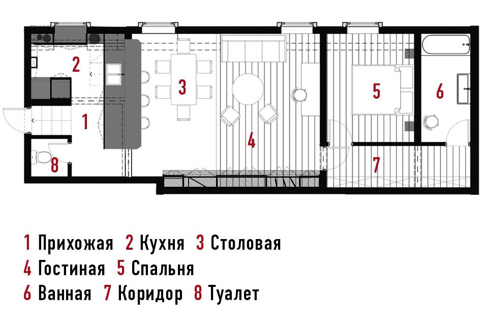 В этой квартире нет лишнего декора, его роль выполняют архитектурные элементы и старинная отделка — фактурные балки, круглые окна, терракотовая плитка и остатки паркета, сохранившегося под ковролином и линолеумом. “Я не люблю синтетические материалы, поэтому стараюсь их избегать. Если кто-то не может позволить себе настоящий мрамор, я не буду использовать его дешевую имитацию”, — признается дизайнер. У хозяйки квартиры был ограниченный бюджет, поэтому столешницы рабочей