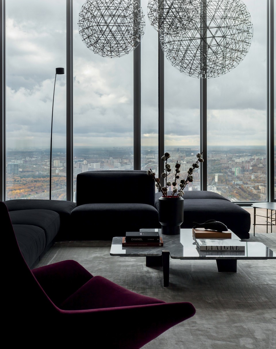 Невероятный вид открывается из окон квартиры в Москве-Сити по проекту Алексея Николашина. Мне понравилось, что он сделал очень легкий интерьер, не избегая при этом насыщенных цветов. Я бы с удовольствием пожила в такой квартире, даже не выходя на улицу, — смотреть на Москву, сидя на огромном диване, можно бесконечно. Елена, по e‑mail