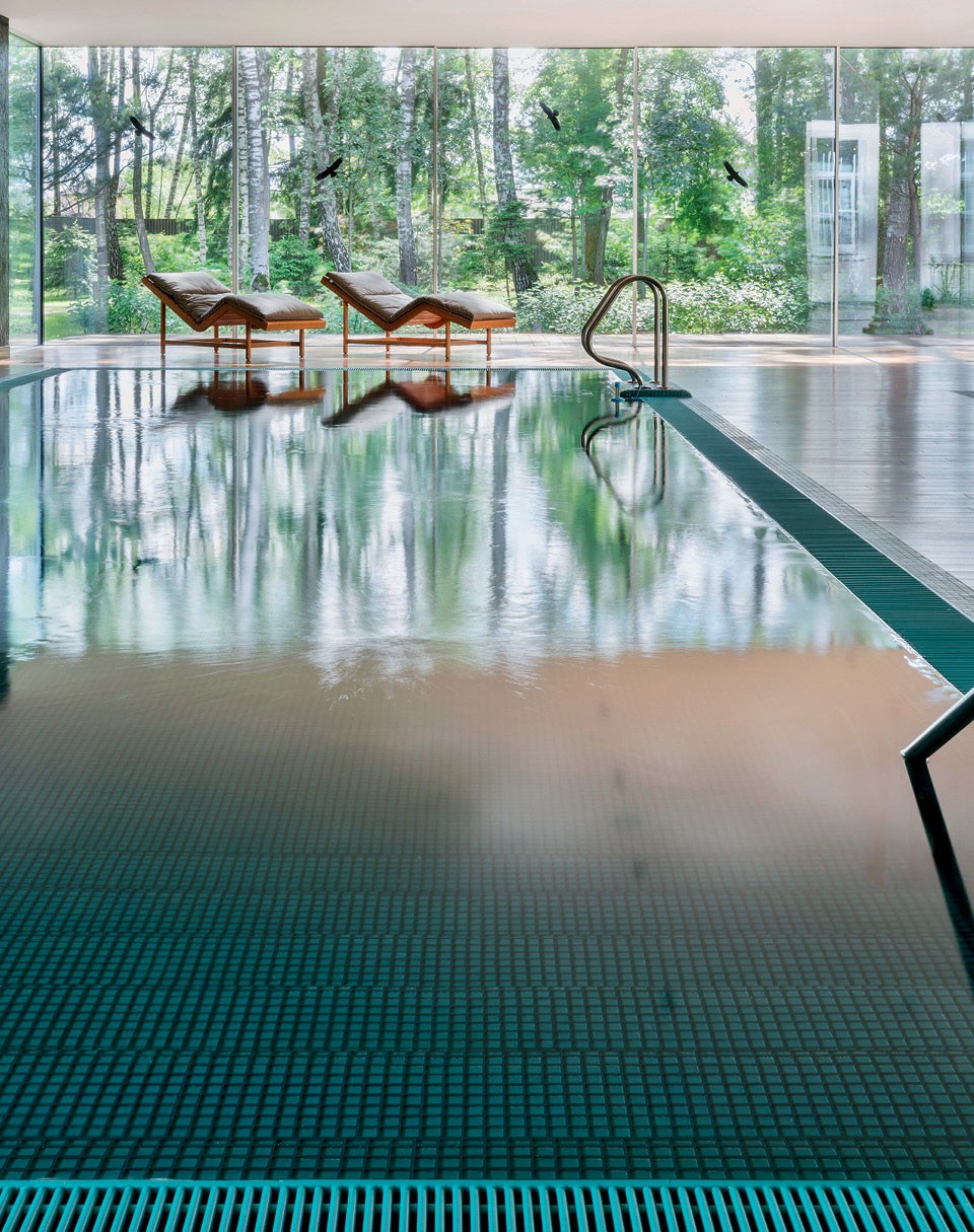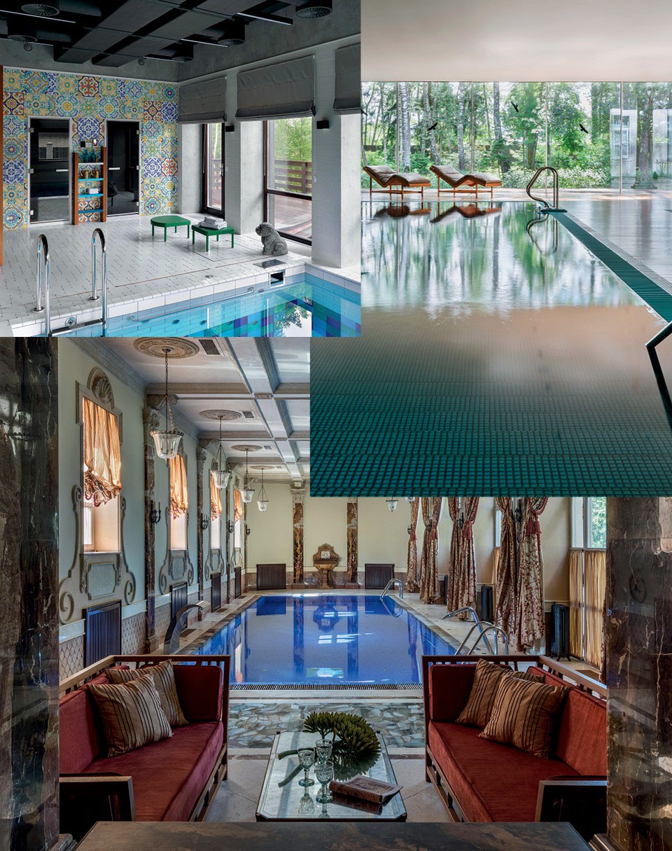 “ЧТОБЫ ИНТЕРЬЕР БАССЕЙНА И ЛАНДШАФТ участка гармонично сочетались и перетекали один в другой, мы решили сделать две смежные стены стеклянными. Получившийся угол выходит на ту сторону, где нет соседей, поэтому мы смогли обойтись без рулонных штор и жалюзи и сделать пространство минималистичным. Вообще обстановка здесь более лаконичная, чем в доме, — это было пожеланием хозяев. При проектировании влажных зон необходимо учитывать не только общую эстетику, цветовую гамму, функциональность, но и соблюдать определенные правила безопасности, санитарные и гигиенические нормы. Мы заранее все учли, поэтому никаких сложностей с проектированием бассейна и зоны спа у нас не возникло”.