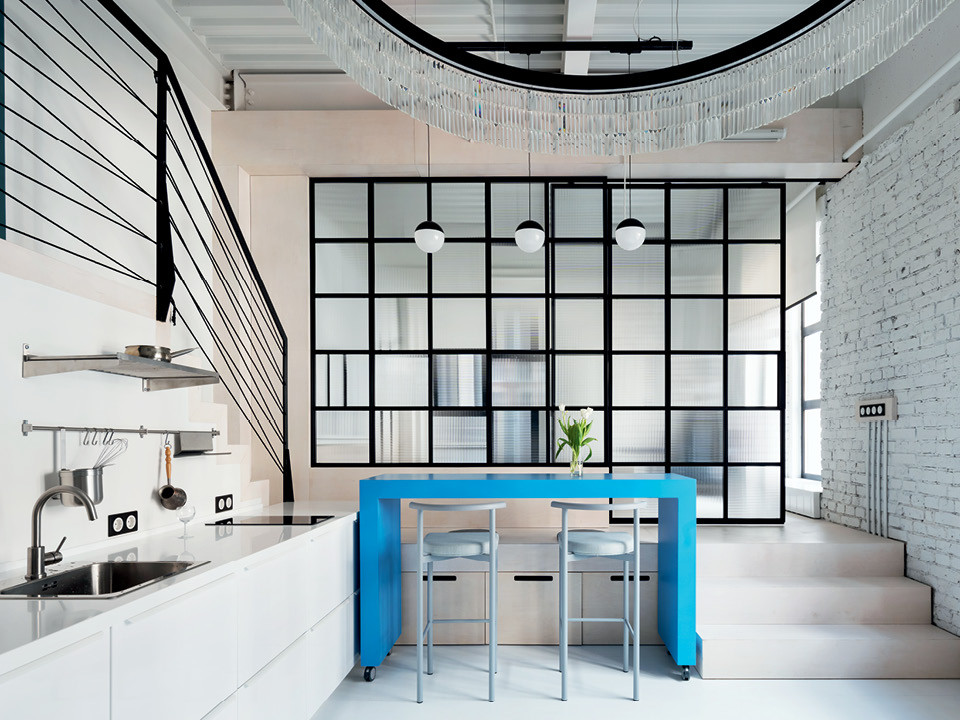 Эти небольшие апартаменты находятся в комплексе Kleinhouse — здании бывшей чаеразвесочной фабрики, построенной по проекту Романа Клейна в начале XX века. Сейчас ее переделали под жилье. Лофтовая стилистика в таком пространстве — логичное и гармоничное решение. Несмотря на то что фасад дома из красного кирпича, в интерьере стены выкрасили белым. “Так маленькое пространство визуально кажется больше, — говорит архитектор Дмитрий Овчаров, один из авторов проекта. — Когда-то я читал, что лофты появились в Америке во времена Великой депрессии. Индустриальные помещения пустовали, люди снимали или покупали в них площади за гроши. Как правило, селилась там богема, у которой было немного денег, а белая краска — самая дешевая. Поэтому вначале все лофты были белыми”. Но главная особенность таких интерьеров не цветовая гамма, а элементы индустриального прошлого. К примеру, в этой квартире на потолке остались профнастил и металлическая балка, по которой пространство разделили на общую зону и спальню.