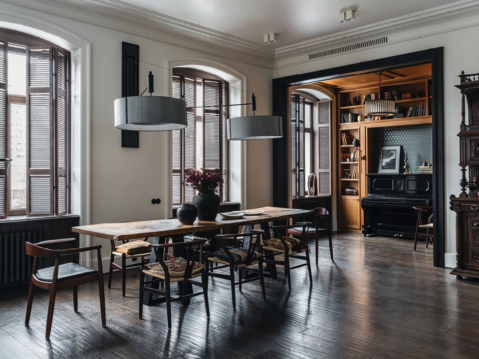 Олег Клодт любит интерьеры с историей и чаще всего вынужден создавать это ощущение с чистого листа, аналогом которого в архитектуре служат голые бетонные стены новостроек. Но для себя самого Олег, по его собственному признанию, жилье в новом доме никогда бы не купил. Квартиру в четырехэтажном доходном доме в районе Грузинских улиц архитектор выбрал по двум причинам: высота потолков и окна — их здесь так много, что хватило даже на ванную. “Для меня самое главное — окно в ванной, а тут их целых два”, — говорит архитектор. Штор в квартире (за исключением одной из детских) нет, вместо них — складные ставни. “Мне хотелось сохранить этот воздух и арочную форму, чтобы ничего не мешало”, — объясняет Олег. И это один из тех моментов, которые отличают квартиру архитектора от проектов, которые он делает для заказчиков. Идейно между ними разницы нет, но здесь все как бы проще, приземленней. Например, дубовые доски для пола нарочно взяты сучковатые, а вместо камина стоит неожиданная для городского жилья печка. “Первая мысль была — сделать камин в углу, на оси от входной двери, но мне не хотелось иметь обычный угловой камин, на который ориентирована вся гостиная, — рассказывает архитектор. — И как раз в процессе ремонта мы с детьми поехали на каникулы в Итальянские Альпы, а там были страшные снегопады — кататься невозможно. Мы пошли гулять и попали в ресторан, где была такая вот печь, — и сразу все согласились, что это то, что нужно”.