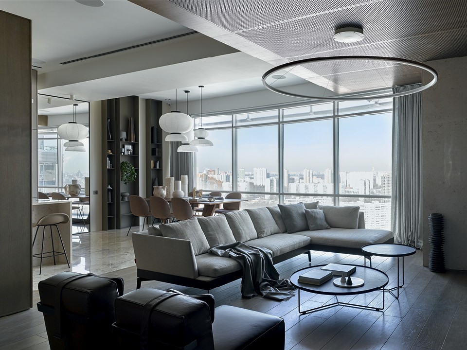 Валерия Дзюба, основательница бюро NIDO Interiors, называет этот проект образцово-показательным. “Он сложился быстро и четко, — говорит она, — а заказчики нам попались с таким уровнем доверия, которое в нынешнее время встретишь нечасто: они появились на объекте всего два раза”. Над московской квартирой Валерия со своей командой трудилась почти полтора года. Им досталось пространство площадью около двухсот квадратных метров, которое они разделили на два больших блока: общую зону и приватную, искусно спрятанную за панелями из разных материалов. Так, со стороны коридора вход в эту часть полностью закрывается зеркальным полотном, а из гостиной сюда ведет незаметная дверь, сделанная из такого же рифленого стекла, что и смежная с ней перегородка.