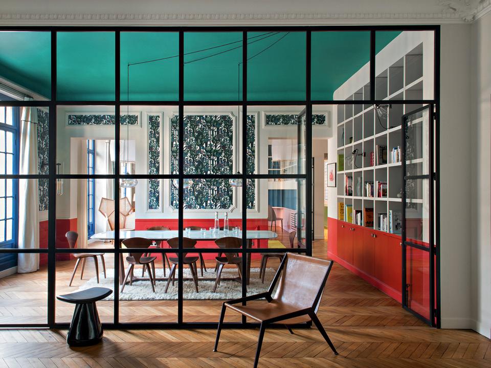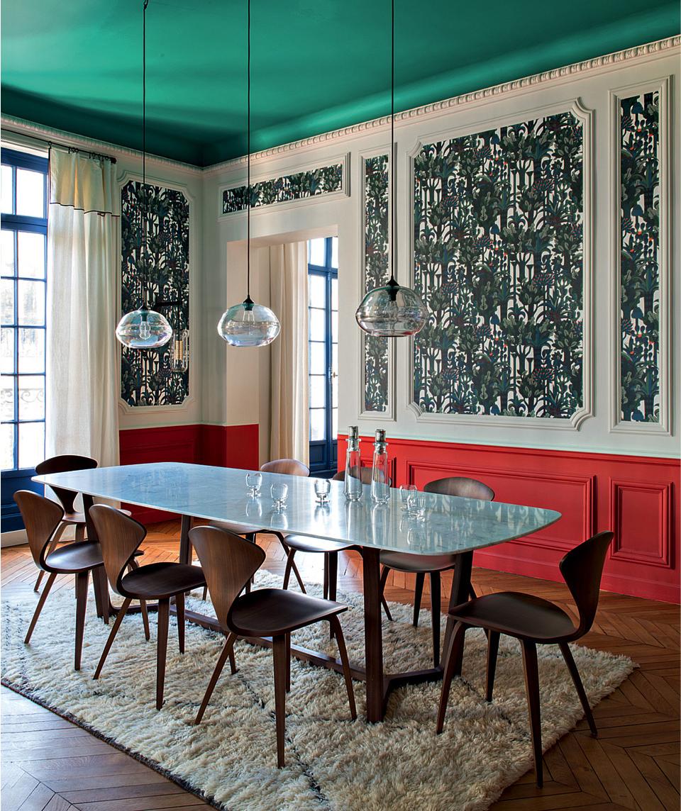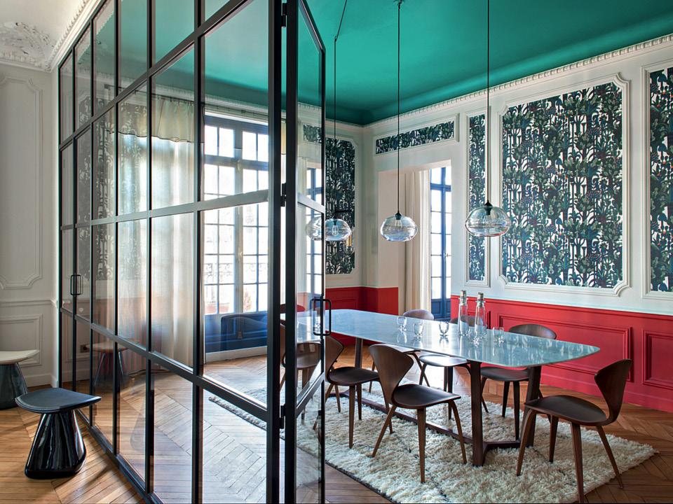 В этом проекте яркий внешний вид столовой отвечает за оформление сразу двух пространств: самой столовой и смежной с ней гостиной. Перегородка из стекла и металла разделяет две зоны не только визуально, но и физически (двери в столовую можно закрыть, таким образом шум и запахи еды не будут беспокоить тех, кто находится в соседней комнате). Да, в помещении появилась лишняя стена, но она прозрачная, поэтому отпала необходимость в ее отделке: через стекло свободно транслируется дизайн соседнего пространства. И архитекторы явно воспользовались этим, оклеив стену в столовой обоями с активным рисунком и выкрасив потолок в яркий цвет. Гостиная же оформлена гораздо спокойнее.