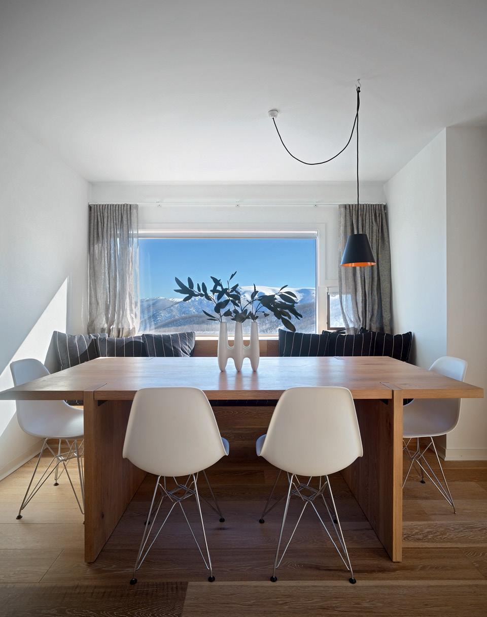 В этой столовой главное — вид из окна. Дизайнеры могли бы даже обойтись без лавочки под окном и сделать больше сидячих мест с другой стороны стола. Ну кто захочет сидеть спиной к такой красоте? По этой же причине обстановка не перегружена деталями: даже лаконичный светильник висит не в центре, а в стороне, чтобы не загораживать “картинку”.