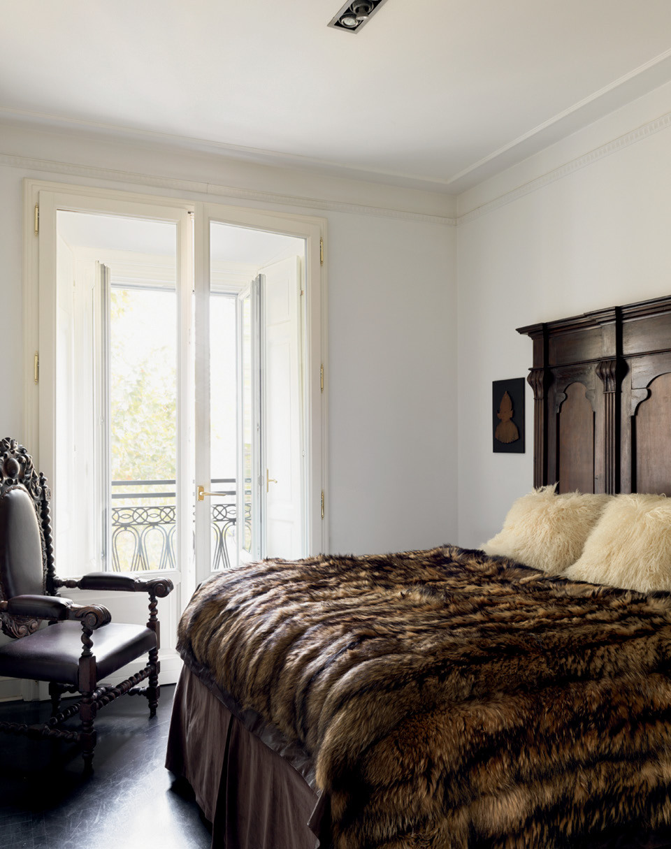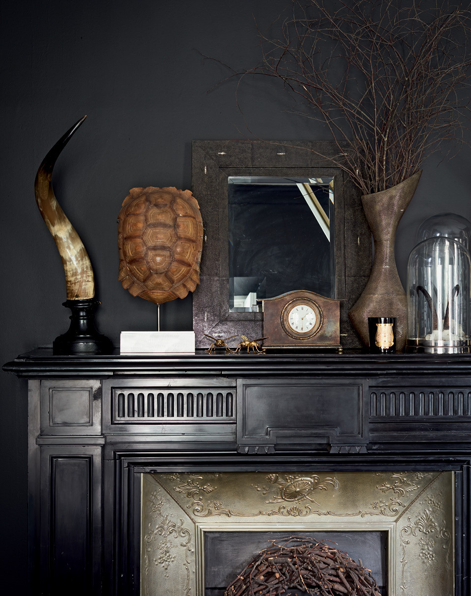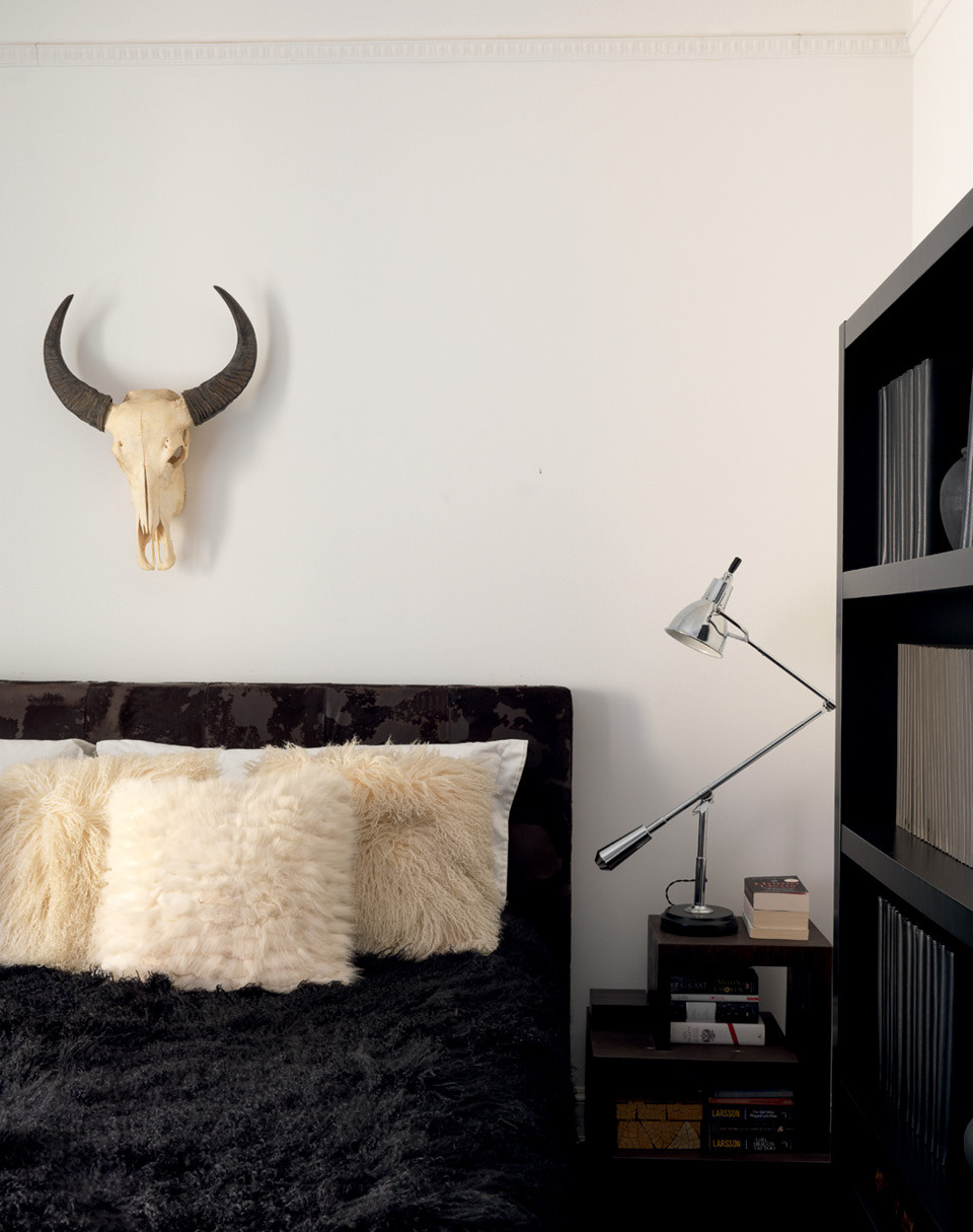 Скудную цветовую гамму интерьера хозяин разбавил богатыми по фактуре элементами — шерстяными пледами, каракулевыми подушками и предметами интерьера, обтянутыми кожей. Их проектируют его давние друзья, дизайнеры Риа и Йиури Аугусти. “Я покупаю что-то из каждой их коллекции, меня можно назвать постоянным клиентом”, — смеется Нил. Анималистичных деталей в квартире много: тут есть черепа, рога, чучело сокола и панцирь черепахи — все найдено на барахолках или в антикварных магазинах. Барретт объясняет это любовью к миру живой природы. “Меня восхищают животные, насекомые и птицы. Они самые красивые создания, которые меня постоянно вдохновляют”, — говорит он. Нил привез сюда много старинных предметов интерьера XVIII и XIX веков, доставшихся ему по наследству. Например, каминный портал (его теперь можно увидеть в столовой), комод и бар с маркетри и кресло-качалку, принадлежавшее его дедушке, который владел мебельной компанией в Плимуте.