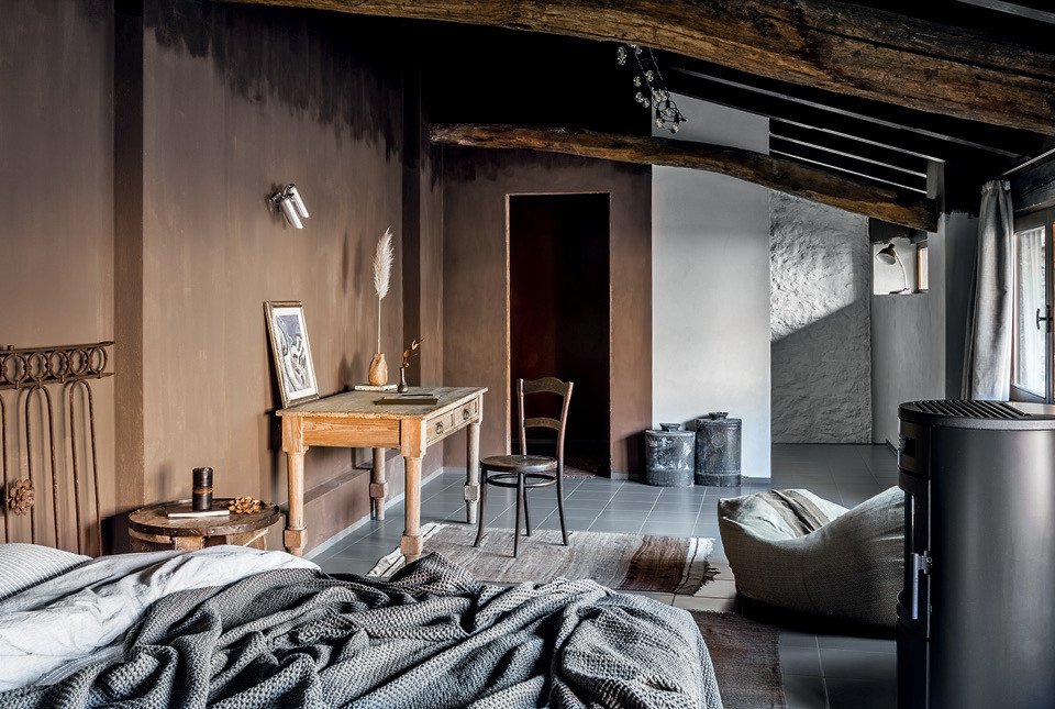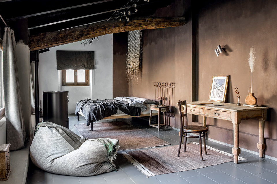 Отделка тоже получилась оригинальной: фактурная стена в ванной осталась после того, как с нее сбили керамическую плитку, а в гостиной стены готовили под покраску, но после нанесения штукатурки передумали — так гораздо живописней. Только в спальне появляется цвет, но и здесь Петр и Дарья постарались создать впечатление, будто это исторические наслоения разных оттенков. На полу на обоих этажах лежала квадратная плитка в мелкую крапинку (такую расцветку еще называют “соль-перец”). На первом ее покрыли эпоксидной затиркой, а на втором покрасили и положили сверху ковры, привезенные из Марокко. Так благодаря смелым решениям архитекторов получился органичный интерьер с итальянской душой.