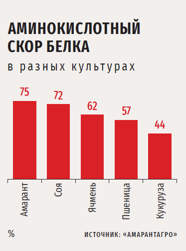 Лабораторные исследования, которые проводились в ряде научных центров, в том числе в лаборатории Воронежского государственного университета, показали, что амарант имеет уникальные характеристики по питательной ценности, говорит Мирошниченко. «Во-первых, в нем очень много белка, причем высококачественного и легкоусвояемого, во-вторых, в культуре содержится много лизина — в три раза больше, чем в пшенице, и в таком количестве этой аминокислоты нет больше ни в одном из изученных растений», — утверждает она.
