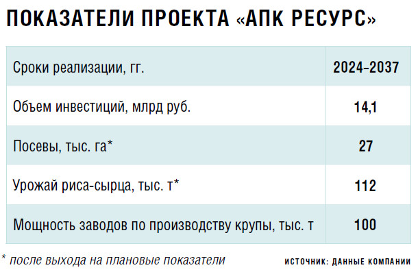 Переход рисоводства в условия рынка в 1990-е годы характеризовался сокращением площади, засеянной рисом в Астраханской области, до уровня 30–35 тыс. га, а к 2008-му посевы и вовсе уменьшились до 7,5 тыс. га, рассказывает заместитель гендиректора «АПК Ресурс» Александр Горкин. «Однако с учетом благоприятных климатических условий региона выращивание этой агрокультуры является здесь одним из самых перспективных направлений, — считает он. — Именно поэтому мы приняли решение о реализации масштабного инвестиционного проекта по созданию сельскохозяйственного комплекса по производству риса “Астраханская рисовая система”, проведению работ по капитальной реконструкции, модернизации и новому строительству мелиоративных систем». Реализация проекта компании позволит увеличить площади рисосеяния на 27 тыс. га.