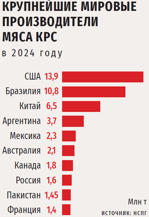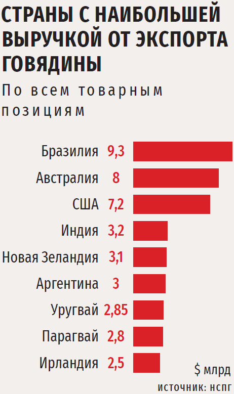 «Лишь благодаря огромным и пока еще не окупившимся инвестициям в мясное скотоводство за последние 15 лет в рамках буквально единичных крупных проектов и увеличению поголовья КРС в КФХ мы в предыдущие годы нарастили поголовье мясного скота, тем самым предотвратив быстрое снижение производства говядины, — отмечает бизнесмен. — Объемы выпуска мяса крупного рогатого скота не падали так сильно, как поголовье, именно потому, что быстро увеличивалась доля мясного и помесного скота и весовые кондиции КРС на убой, за 10 лет средний товарный вес вырос почти на 35 %». По производству говядины по итогам 2024 года Россия заняла восьмое место в мире, знает Костюк. Однако в финансовом выражении объем данной отрасли существенно меньше, чем у других стран — крупных поставщиков. «Получается, что производить это мясо российские компании могут, а деньги зарабатывать — нет, — отмечает эксперт. — В этом и состоит весь парадокс: объем поголовья КРС в России сравним с показателями Австралии и Канады, однако Австралия зарабатывает до $8,5 млрд в год на экспорте живого скота и говядины по всему миру, находясь в самой дальней точке планеты, а Канада – $2,1 млрд, в то время как в России общий показатель выручки от данной деятельности составляет лишь $0,4 млрд».