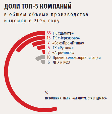 Еще один тренд индейководства (совпадающий с общим трендом в птицеводстве) — сосредоточение производства в руках крупных и средних предприятий. Они уже дают стране около 93 % от всего объема выпускаемой индейки. Причем 85 % в 2024 году пришлось лишь на пять компаний — «Дамате», «Черкизово», «СоюзПромПтица», «Руском» и «Агро-плюс» (в 2023-м их доля была 83 %). Более 50 % производства обеспечивает лидер отрасли — компания «Дамате».