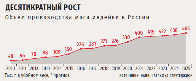 В секторе мяса птицы наиболее динамично растет производство индюшатины. Так, если в 2024 году в целом птицеводство прибавило 2 %, то объем выпуска в сегменте индейки увеличился на 3,8 %. Согласно данным Минсельхоза, по итогам прошлого года в России произведено 438 тыс. т этого вида мяса в убойном весе. Российские производители уже обеспечивают более 95 % внутренней потребности в этом продукте, а его потребление в стране увеличивается на 10 % ежегодно, отмечает исполнительный директор Национальной ассоциации производителей индейки (НАПИ) Анатолий Вельматов. По его оценке, доля индюшатины в общем производстве мяса птицы увеличилась с 6,5 % в 2020 году до 8 % в 2024-м.