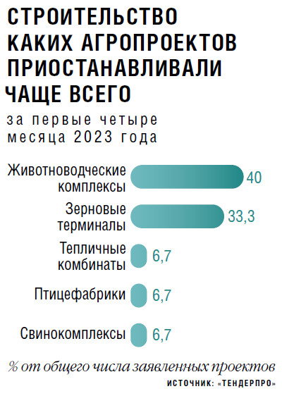 По оценке компании, чаще всего с начала этого года агроинвесторы приостанавливали строительство животноводческих комплексов (40 % всех проектов), зерновых терминалов, тепличных комбинатов, птицефабрик и свинокомплексов (см. график на стр. 29).