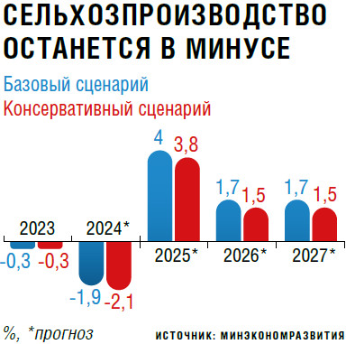 Согласно базовому прогнозу Минэкономразвития, в этом году сельхозпроизводство может снизиться на 1,9 % после сокращения на 0,3 % в 2023-м. При этом в 2025 году производство продукции сельского хозяйства увеличится на 4 %, в 2026 и 2027 годах — на 1,7 %, считает ведомство. Консервативный сценарий предполагает рост на 3,8 % в 2025-м, а в последующие два года — по 1,5 %, однако в этом году данный сценарий допускает снижение производства на 2,1 %. Минсельхоз в проекте Национального доклада о реализации госпрограммы развития сельского хозяйства по итогам 2023 года прогнозировал, что в этом году сельхозпроизводство уменьшится на 2,9 %, в том числе растениеводство — на 6,5 %.