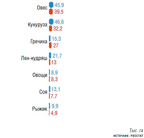 Валовой сбор масличных культур в Татарстане, по информации Щербиной, в прошлом году составил 488,1 тыс. т. Основная масличная культура в регионе — подсолнечник (на нее приходится 62 % общего производства), второе место занимает яровой рапс, или кольза (29 %). Также в республике популярны нишевые масличные, такие как горчица, лен-кудряш, рыжик. По площадям последнего в 2023 году Татарстан занял третье место в стране, несмотря на то что по сравнению с 2022-м его посевы сократились в два раза, следует из данных Росстата (см. график).