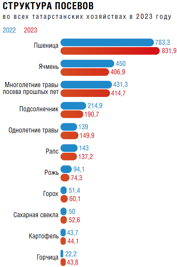 Доля АПК, включая пищевую промышленность, в ВРП в прошлом году составила 6,5 % с показателем 590,8 млрд руб. Объем валовой продукции сельского хозяйства достиг 289,2 млрд руб. По данному показателю республика входит в топ-5 регионов России, обращает внимание министр. Располагая 2 % сельхозугодий страны, аграрии Татарстана выпускают 3,5 % общего объема отечественной сельхозпродукции. Данные показатели достигнуты в том числе благодаря проведению комплекса мероприятий по модернизации существующих мощностей и реализации новых инвестиционных проектов, отмечает он. «Наш регион — бесспорный лидер по производству молока в России, за нами более 6 % всего валового надоя! Также стабильно входим в десятку крупнейших производителей основных видов аграрных товаров, таких как мясо, зерно, картофель, сахарная свекла и яйца», — подчеркивает Зяббаров.