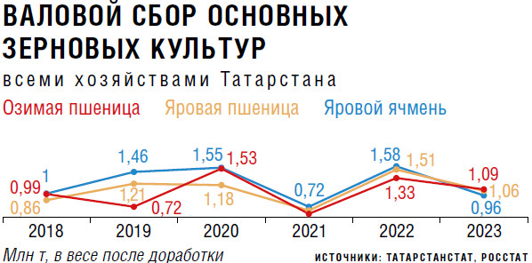 Татарстан — один из основных производителей зерновых и масличных культур Поволжья, утверждает эксперт зернового рынка подведомственного Минсельхозу «Центра Агроаналитики» Оксана Щербина. По итогам 2023 года в регионе было собрано чуть более 3,6 млн т зерна. Основными культурами для республики являются пшеница и ячмень — около 60 % и 30 % общего урожая зерновых культур соответственно. «Из-за погодных условий исторически в регионе больше тяготеют к выращиванию яровой пшеницы, однако в последние годы объемы сбора озимой и яровой пшеницы практически равны, — акцентирует внимание она. — Например, в прошлом году они составили соответственно 1,09 млн т и 1,06 млн т, при этом средняя урожайность озимой пшеницы в Татарстане тогда была на уровне 30,2 ц/га, яровой — 22,6 ц/га».
