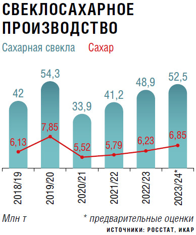 Посевы сахарной свеклы в 2023 году, по уточненным данным Минсельхоза, на которые ссылается Институт конъюнктуры аграрного рынка (ИКАР), оказались в среднем на 1,6 % выше, чем в 2022-м, и составили 1063,6 тыс. га, что в совокупности с увеличившейся средней урожайностью — до 493,4 ц/га против 475,4 ц/га годом ранее (по состоянию на 8 декабря) — стало залогом хорошего урожая.