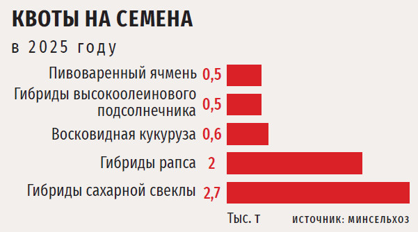 Квоты на приобретение импортных семян были введены Минсельхозом в 2024 году. Разрешенный к ввозу объем тогда составил 33,3 тыс. т. В результате поставки семенного материала по итогам прошлого года сократились почти в 2,5 раза — до 29,8 тыс. т против 73,2 тыс. т в 2023-м (данные Россельхознадзора). В текущем году ограничения еще более строгие: общий объем квот на импорт из недружественных стран составляет 18,3 тыс. т. Главная причина ужесточения ограничений — стимулирование аграриев приобретать отечественные семена. Кроме того, прошлогодние квоты не были до конца выбраны даже по самым проблемным агрокультурам, отметила Оксана Лут. Так, по семенам сахарной свеклы объем был освоен на 90 %, а по кукурузе — на 60 %.