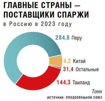По оценке Национального союза производителей плодов и овощей (Плодоовощной союз), бо́льшая часть спаржи, потребляемой в России, завозится из-за рубежа. В 2023 году общий объем импорта составил почти 464,7 т, информирует директор по развитию Плодоовощного союза Елизавета Самигуллина. Основные страны-поставщики — Перу, Таиланд и Китай (см. график ниже).