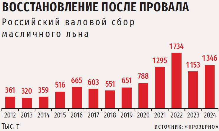 Долгое время переработка концентрировалась на подсолнечнике, сое и рапсе, сейчас рынок дошел до логичной идеи расширения ассортимента в сторону нишевых, комментирует Плужников. Хотя, по словам эксперта, лен уже вышел из этого разряда. «В прошлом году урожай данной позиции составил 1,35 млн т, — знает он. — Это очень достойный результат — выше показатель был только в 2022-м, тогда наши растениеводы собрали 1,74 млн т».