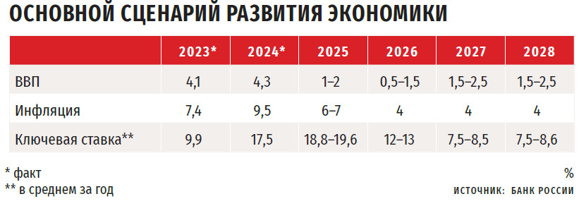 В базовом сценарии Банк России исходит из того, что внешнеторговые противоречия между крупнейшими экономиками продолжат сдерживать рост мирового спроса, а введенные внешние санкции на среднесрочном горизонте сохранятся. По прогнозу, в структуре экономики будет преобладать внутренний спрос, доля экспорта и импорта в ВВП будет меньше, чем в досанкционный период, а темпы увеличения потребительского и инвестиционного спроса в 2025–2026 годах станут более умеренными, чем в предыдущие два года. Экономический рост в базовом сценарии временно замедлится до 1–2 % в 2025 году и 0,5–1,5 % в 2026-м. В 2027 году экономика «устойчиво вернется к потенциальным темпам роста в 1,5–2,5 % в год». Годовая инфляция уже в этом году снизится до 6–7 %, вернется к 4 % в 2026-м и будет находиться на цели 4 % в дальнейшем. Ключевая ставка в 2025 году в среднем составит 18,8–19,6 %, в 2026-м — 12–13 %. В следующие два года она будет находиться в диапазоне 7,5–8,5 %, что «соответствует оценке долгосрочной нейтральной ставки в российской экономике», отмечает ЦБ.